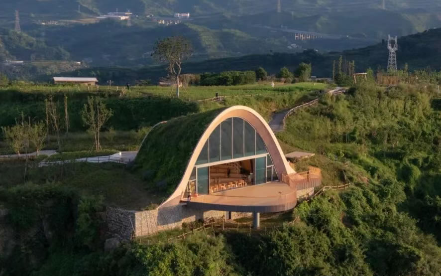 观景台坐落于成都南部的丘陵之中,主要包含一座覆土的拱形木结构,既为游客提供了一个观景目的地,也是一个综合功能的活动空间,充分利用了蜀地壮丽的自然风光。