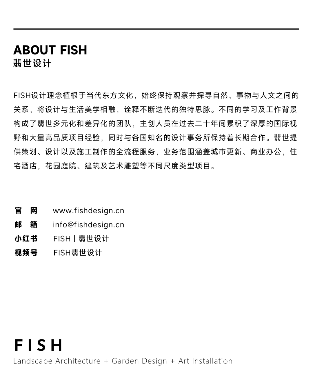 FISH 翡世设计于2012年在上海创立,FISH一词涵盖Founded In ShangHai之意,我们立足并长期深耕于此,期望透过这座城市的发展共创时代影响力。近两年,我们的景观项目分别荣获 2025 ASLA 美国景观设计师学会专业奖、 2025 IFLA 国际风景园林联合会杰出奖2024 WLA 世界景观专业大奖 以及 2024 LILA 国际景观建筑特别奖。目前团队正在寻找充满热情、审美优秀的设计师小伙伴加入我们!