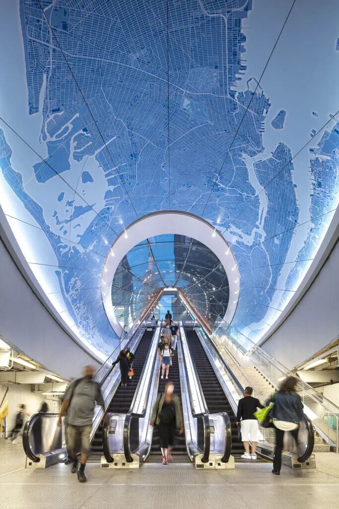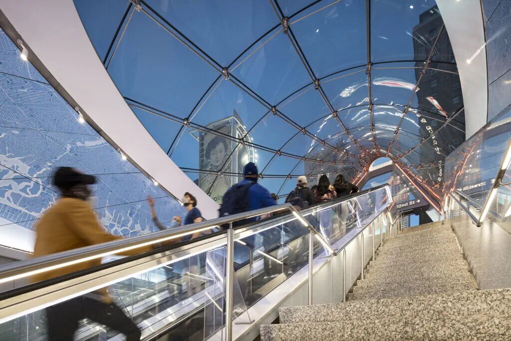 第一阶段:打造全新标志性 “门户入口” – 改善可达性与辨识度(2020年完工):全新的宾州车站东端入口(East Gateway),解决了地面与地下车站的直达衔接难题,并与车站现有入口形成互补,显著提升了周边区域的进出站通行能力。