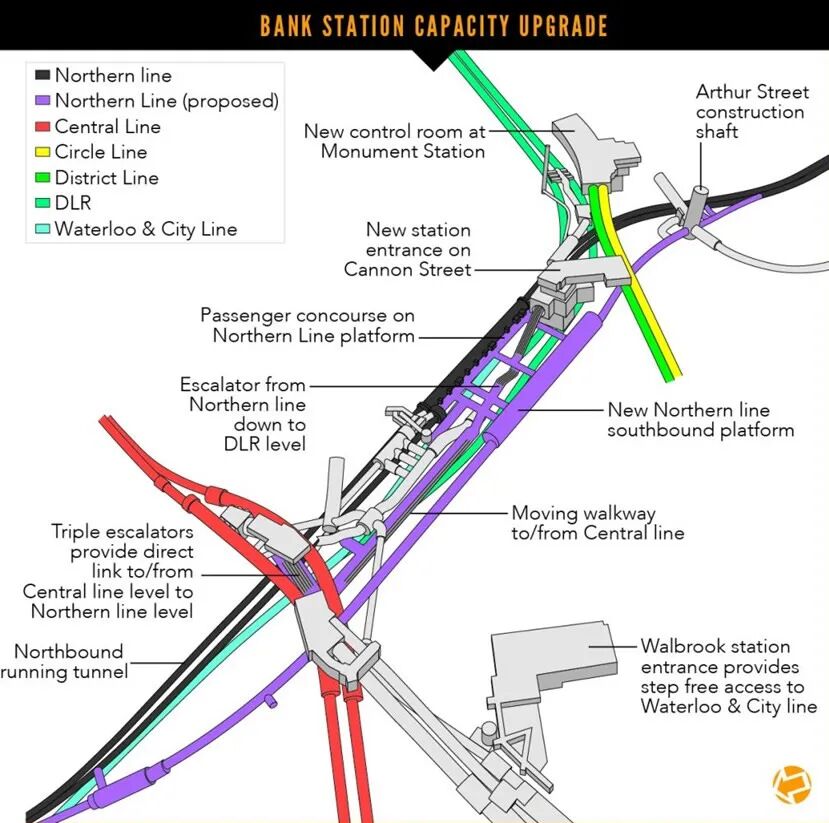 这座在1900年就开始运营的老牌车站,曾因空间局促、换乘路径曲折,一度被伦敦市民评为“最差地铁站”。为此,伦敦交通局(TfL)启动了一系列改造工程,以提升银行站的客运量,并改善站内通行效率。