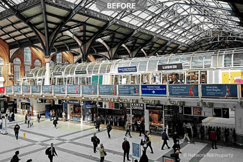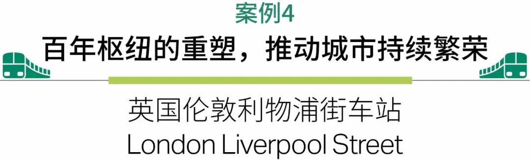 历经百年扩建,利物浦街车站不断接入不同时期、不同制式的线路,车站结构复杂、空间局促,长期面临拥堵严重、换乘效率低和设施老化等挑战,亟需升级。因此,在英国铁路网公司地产部门(Network Rail Property)的牵头下,改造计划不仅旨在改善乘客体验,更将把利物浦街车站打造为一个全新的“城市目的地”,融入零售、休闲与办公空间。改造后的车站将进一步强化与伦敦金融城及公共空间的连接,成为推动伦敦乃至更广区域长期经济增长、繁荣与机遇的重要催化剂,预计每年将带来近46亿英镑的收入。