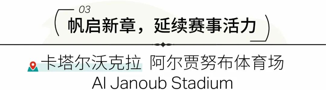 作为2022年卡塔尔FIFA世界杯的八大官方赛事场馆之一,阿尔贾努布体育场以“让赛事留下可持续遗产”为理念设计:赛事结束后,场馆容量从4万缩减至2万,拆除的座椅经国际足联协调,捐赠予体育基础设施待完善的国家。改造后的场馆成为沃克拉体育俱乐部的永久主场,并持续作为当地文化遗产园区的核心地标发挥作用。