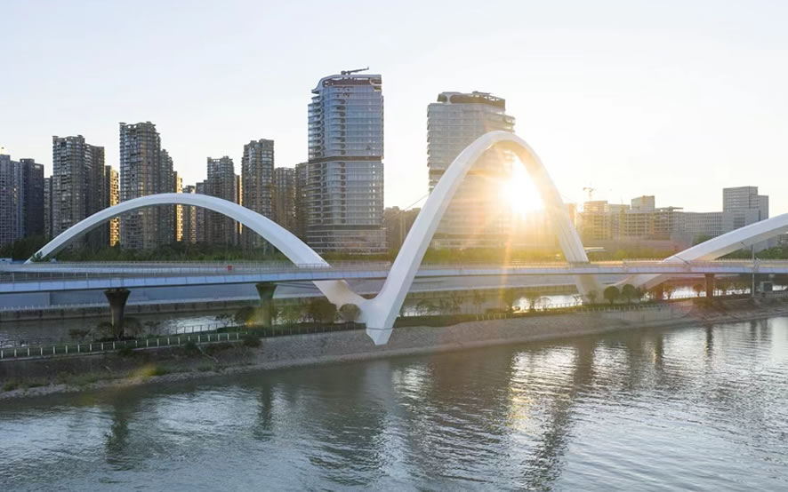 这座步行桥及其周边规划由扎哈・哈迪德建筑事务所(ZHA)设计,通过整合住宅、办公空间、配套设施与休闲旅游类核心公共空间,将杭州重新与历史悠久的大运河、钱塘江之间建立联系。