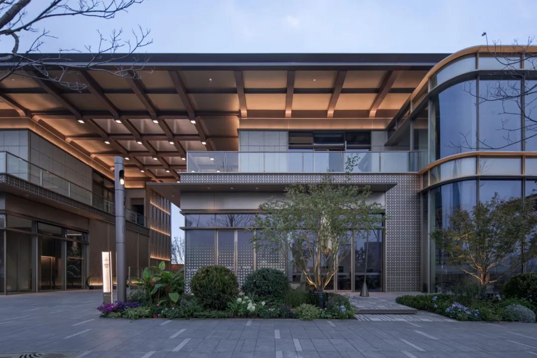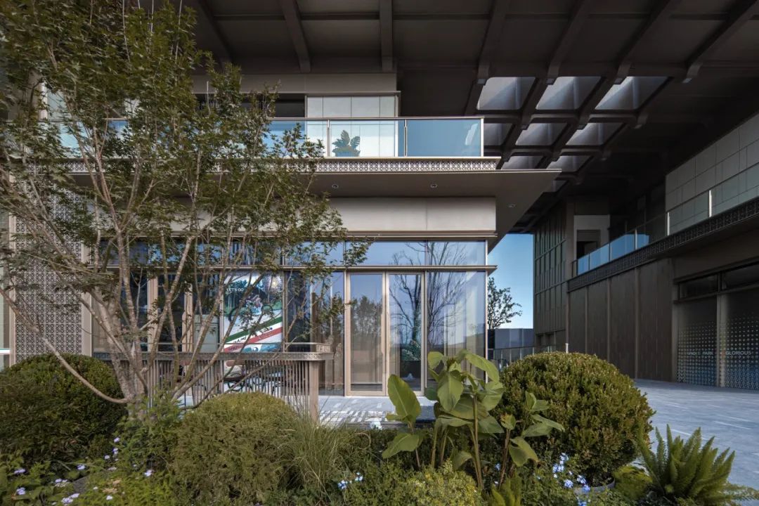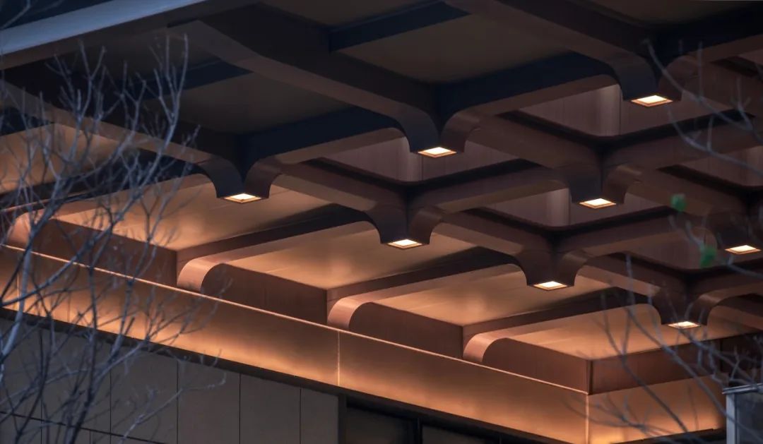 同时采用玻璃幕墙与穿孔铝板的材质碰撞,既延续工业遗存的硬朗气质,又以光影交错的细节诠释现代美学。建筑背面的木色分隔造型以沉稳的秩序感平衡整体形态,而错层分布的铝板肌理则暗藏工艺匠心,形成低调的视觉张力。