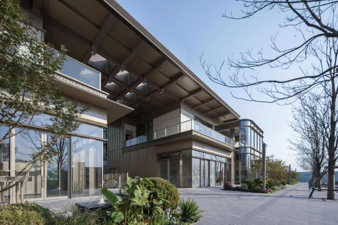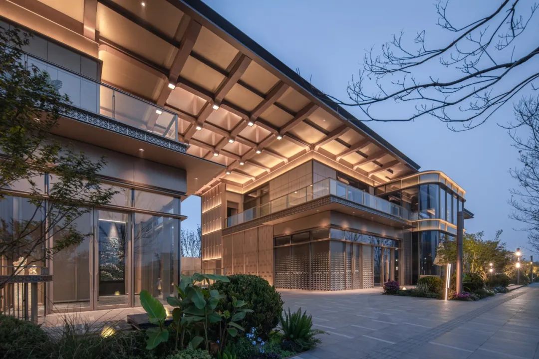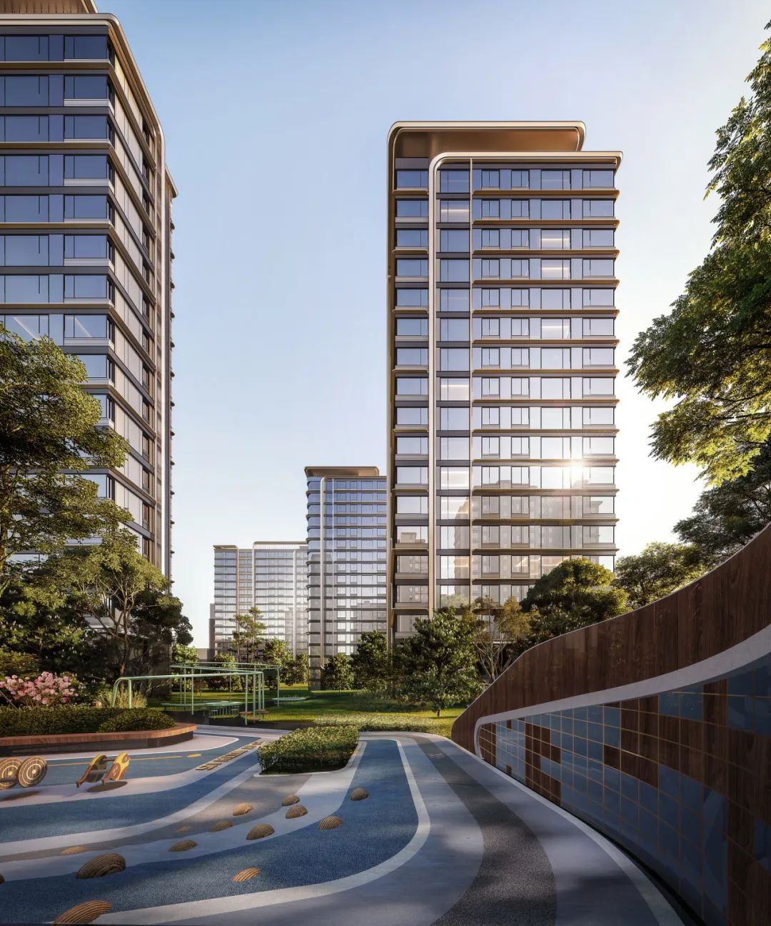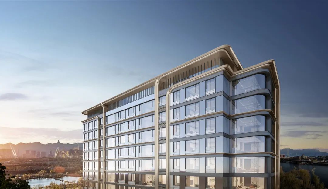 立面设计采用去风格化的设计手法,回归设计本身,追求极致的建筑美学。从钢厂建筑汲取灵感,以香槟金色铝板+灰色铝板+背板玻璃为主材,舒展的水平线条与局部曲线的运用赋予建筑柔和的姿态,弧形转角窗突破了高层住宅边缘锐利的传统形态,赋予建筑更多的浪漫气质,同时也为室内引入更加宽阔的景观视野,呈现线条流畅又富有层次的立面风格。