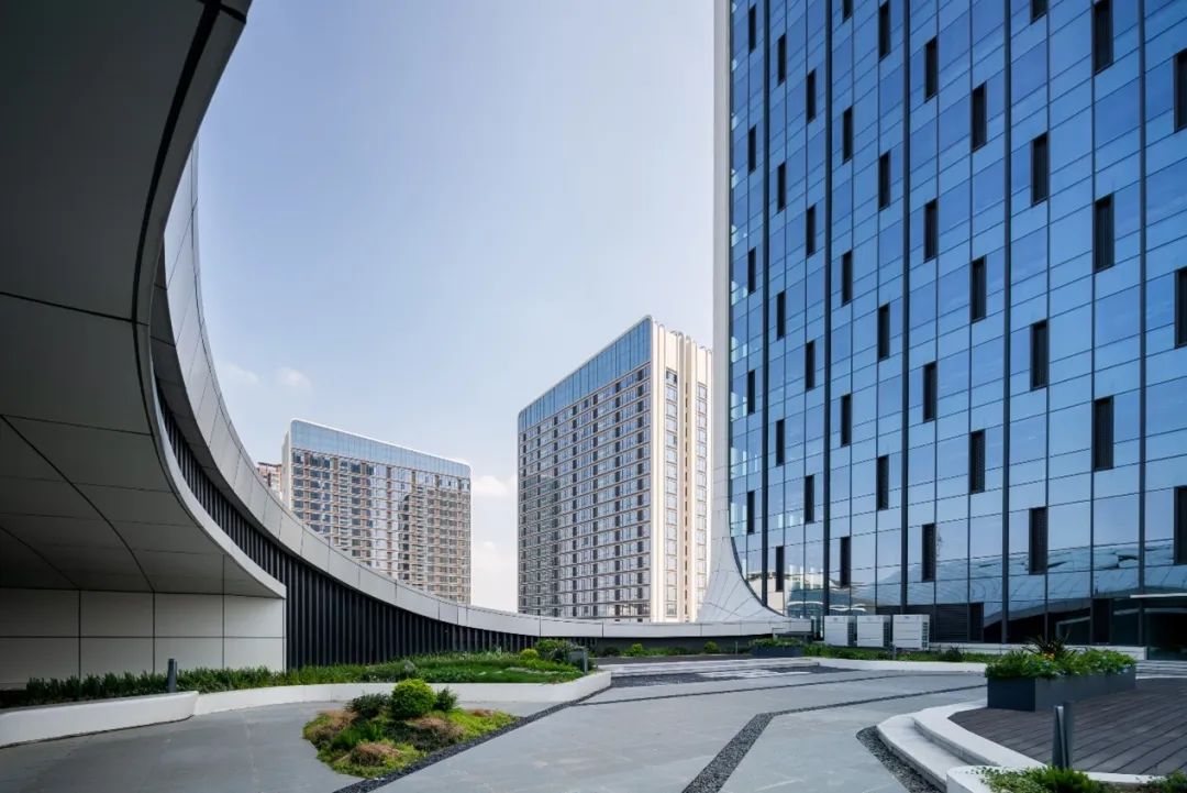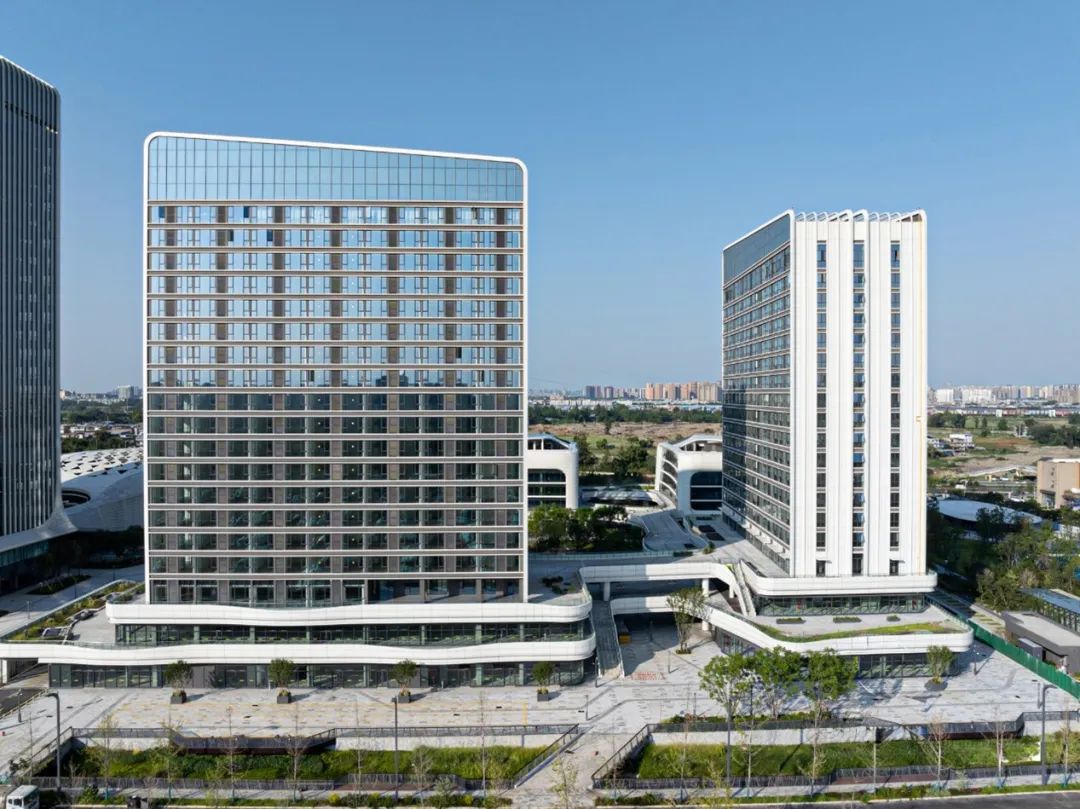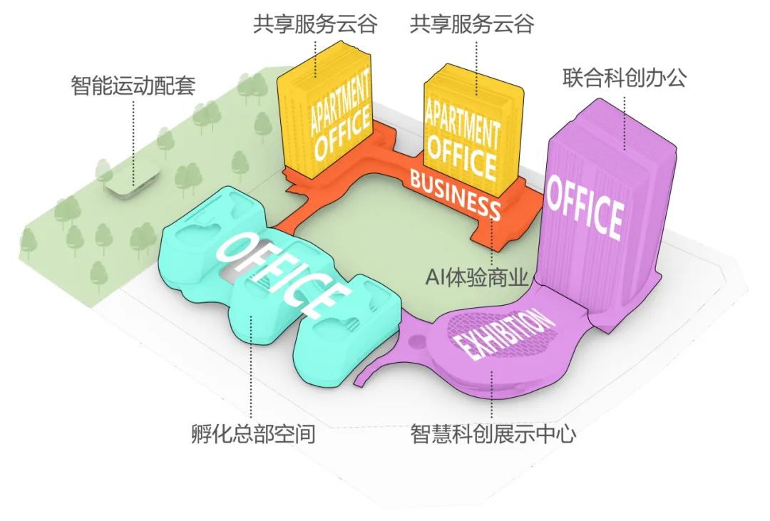 项目包含孵化总部空间,智慧科创展示中心,共享服务云谷,AI商业体验等空间载体,以裙楼与空中连廊串接下层公共空间,实现功能多元共享;智能运动配套,为企业提供优质全面的办公场所与生活休闲服务。