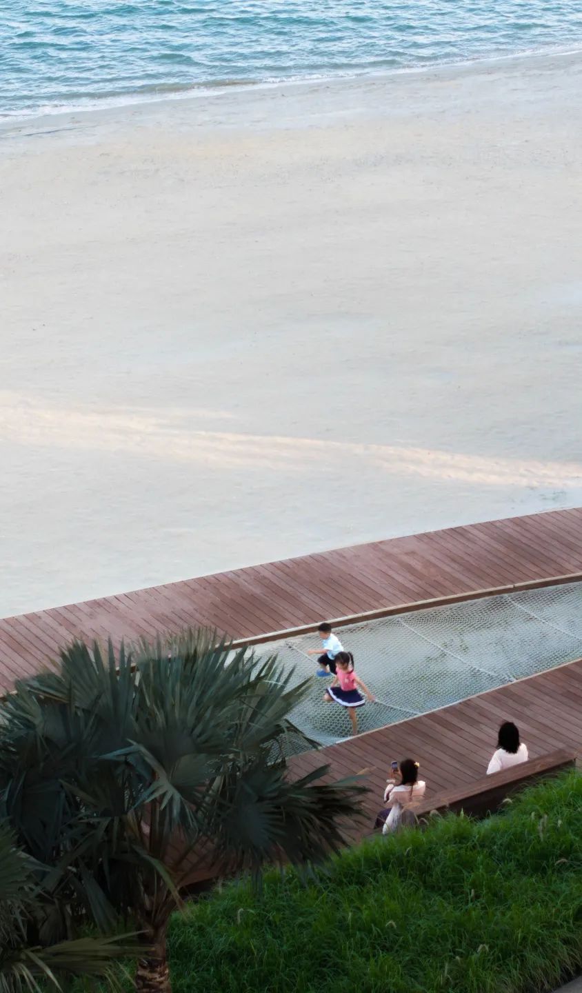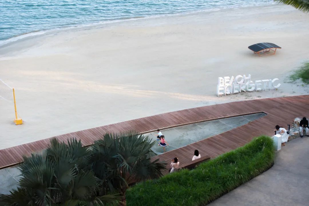 椭圆形的躺网可以接纳大人慵懒的躺姿,也可以承托蹦跶的小孩;一场沙滩台克球,成为潮流运动的先行者;又或者去打一场邻里沙滩网球吧,酣畅淋漓的运动中建立新的关系。