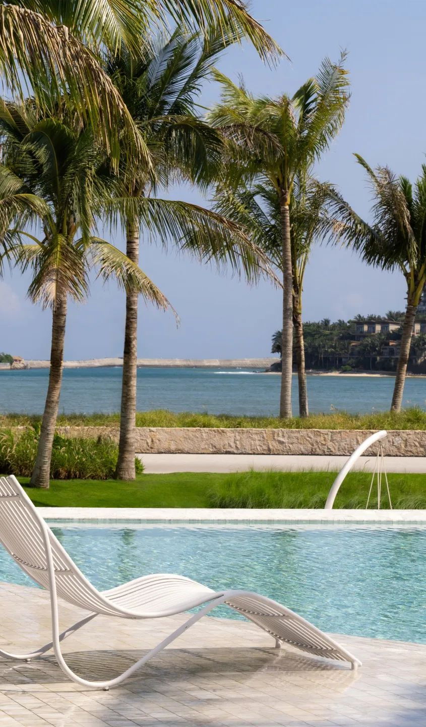 高大的芭蕉树、毛绒绒的海草植物,大面积绿色如同置身绿野仙踪般的森语秘境,而转身靠在纯白的座椅上,面朝无垠的大海,又是另一番辽阔的可能。