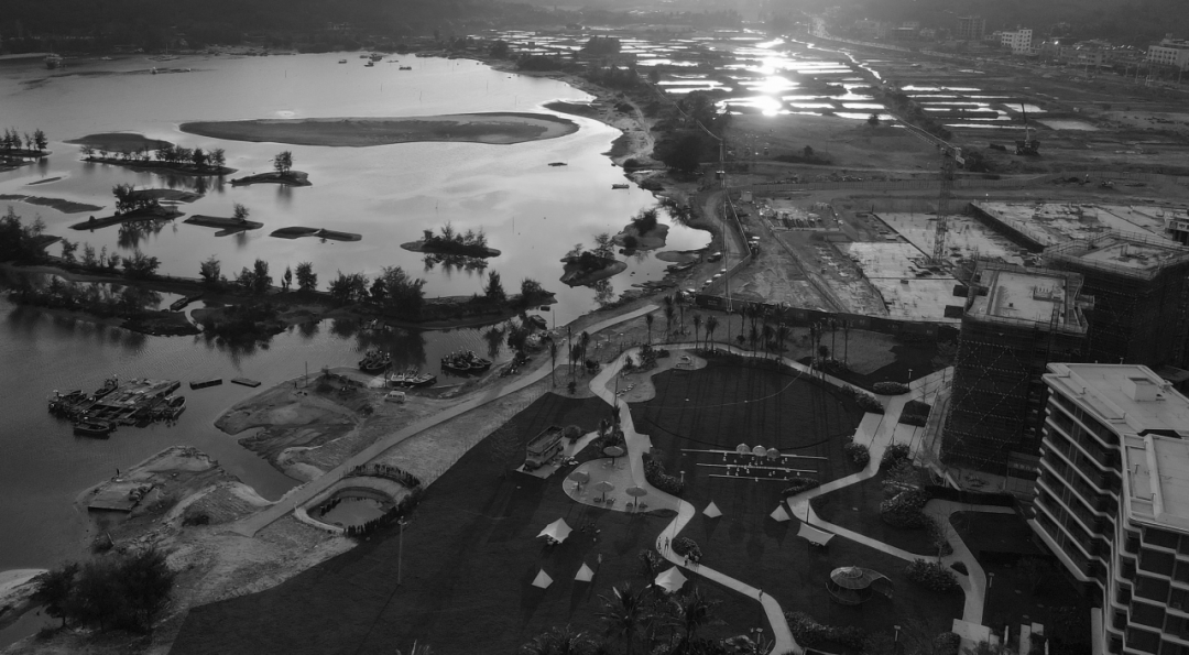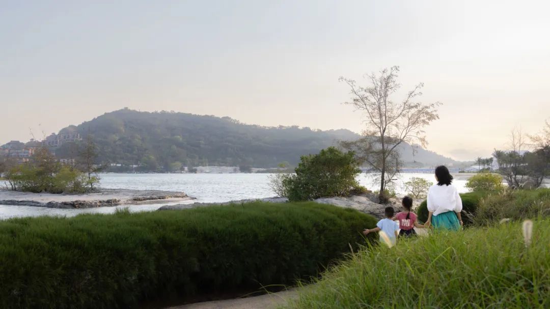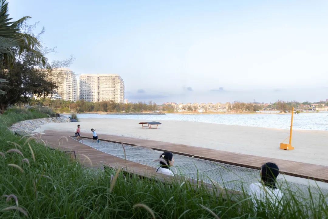 面对杂乱的边界、裸露的荒滩、质感较差的沙滩等问题时,我们选择尊重原生场地,保留这些岛屿和红树林,同时梳理驳岸、清淤治沙、修复生境,引入大量在地植物群落,与社区形成自然围界,打造自然野趣的滨海生态公园。