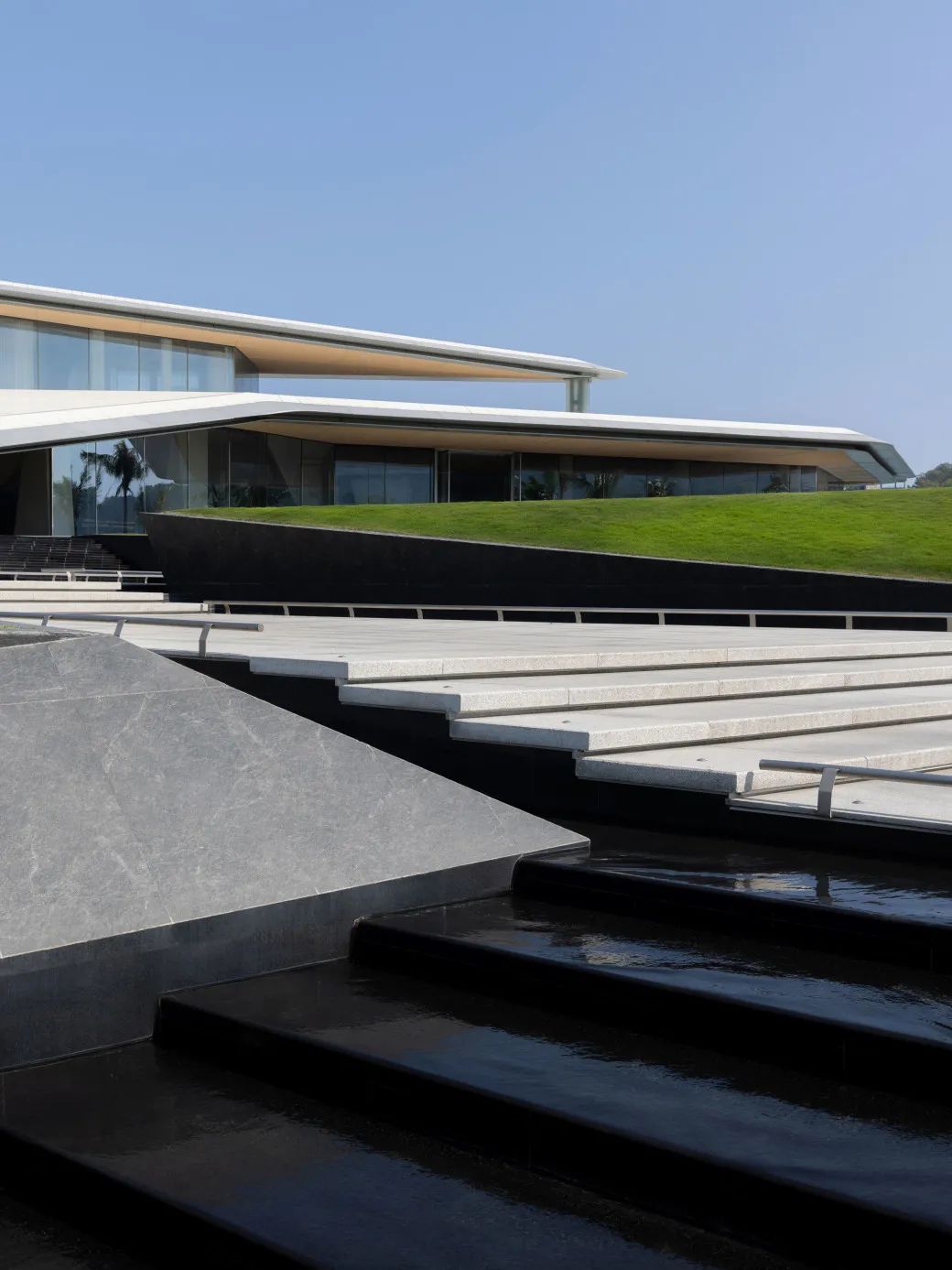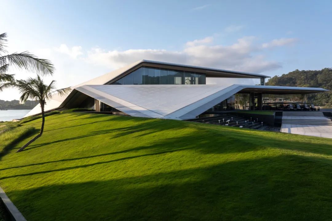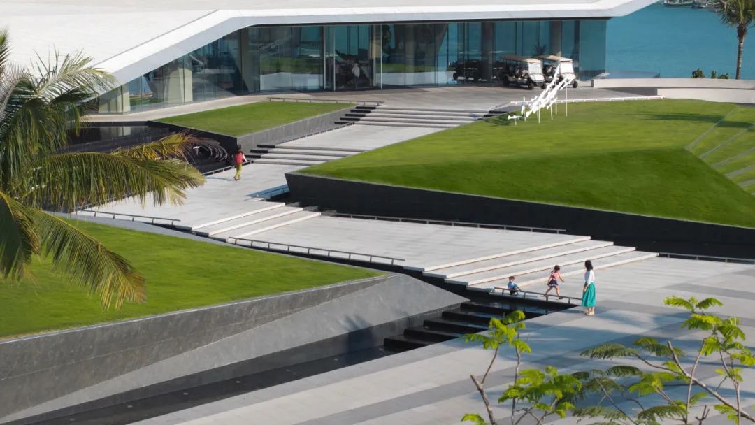 大面积几何状的地景草坪,呼应了建筑的游艇形态,并与其构成了“海-船-礁石”的生态关系,而游艇的精细与自然的粗犷又给人们带来感官的反差。