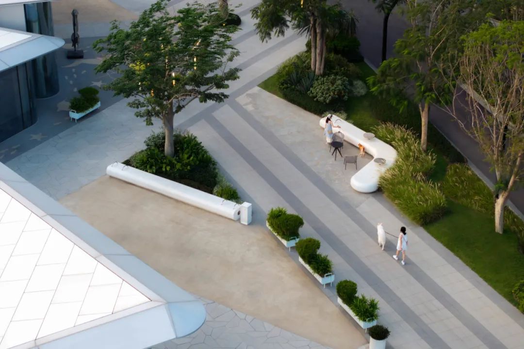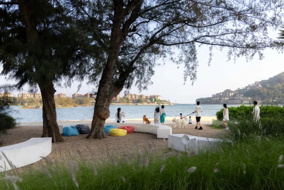 岸边有三棵原生的高大树木,它们曾见证着这片海域一轮又一轮的变迁,我们选择将其保留,并在树下增设充满艺术感的白色弧形座椅,供人们休憩闲谈,放空看海,与不断生长的场所谱写新的回忆。