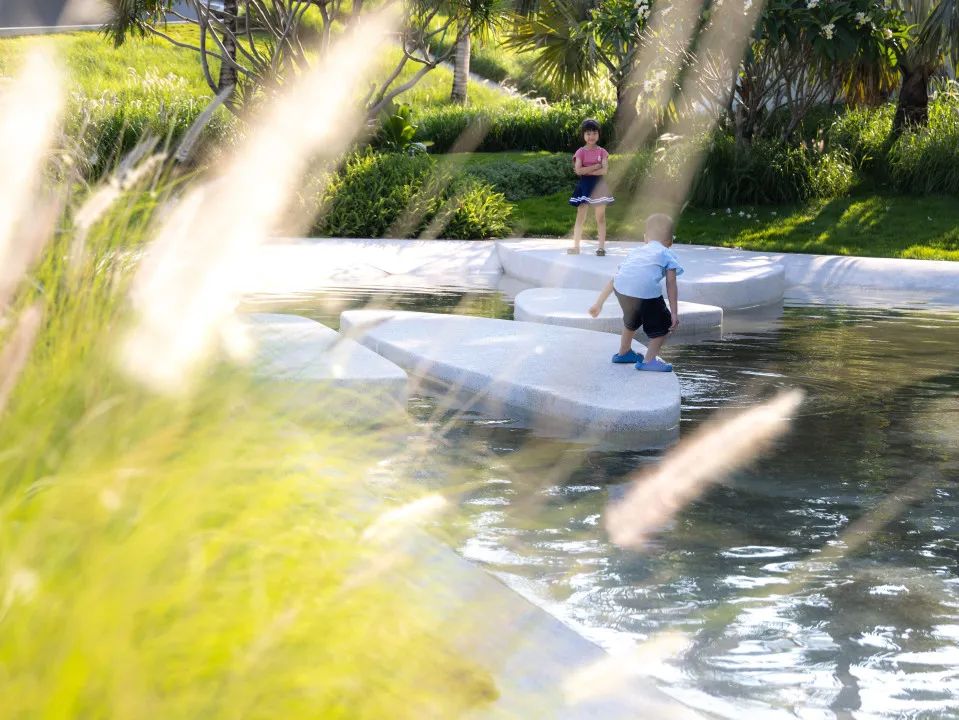 孩子们沿着蜿蜒的水溪戏水前进,狼尾草丛随风摇动,轻盈诉说海风的故事,亲子关系在这里张弛舒展又亲密连接。