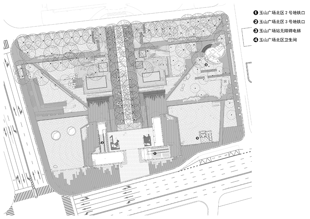 昆山玉山广场站地铁出入口及景观配套设施项目,亦称“新玉山广场”,是以苏州轨道交通地铁开发建设为契机而展开的城市更新工程的一部分,其包含昆山玉山广场地铁站1、2、3号地铁口和原玉山广场及其南延部分的景观提升工程。设计工作始于整个玉山广场及其周边片区的城市更新设计。
