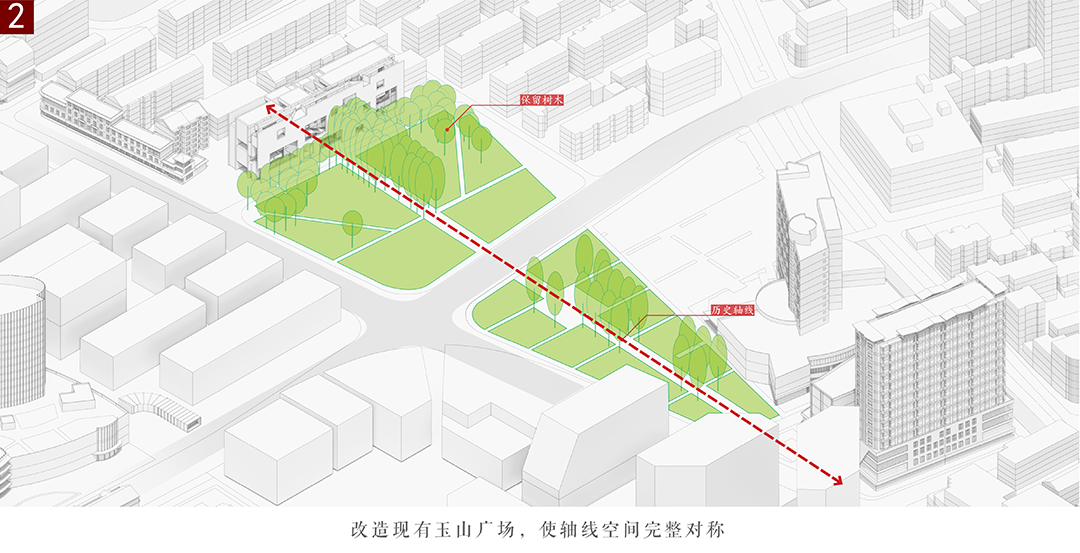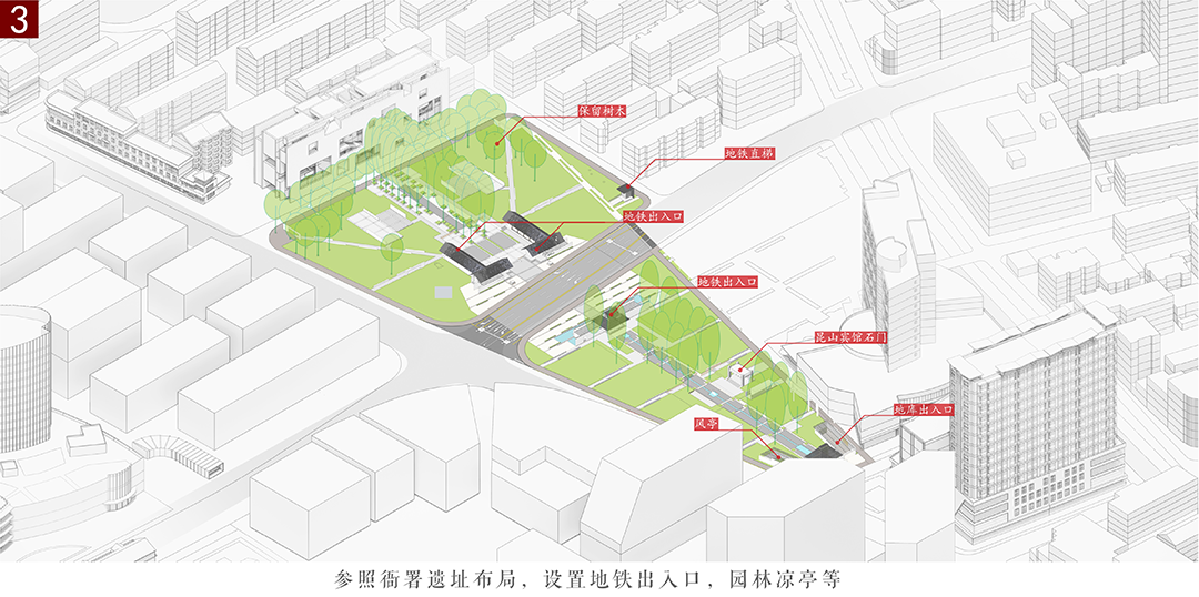 实现这一点需要在地面上将原本错位的南侧人民北路西移至此,正交为十字路口。新道路移位后与东侧昆山宾馆之间的楔形空地构成了最初始的场地环境。它被定义为景观步行区域还于市民,从而形成向南扩展的新玉山广场这一城市公共空间。