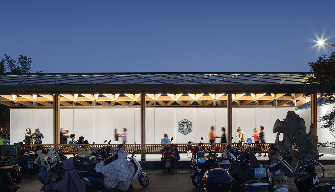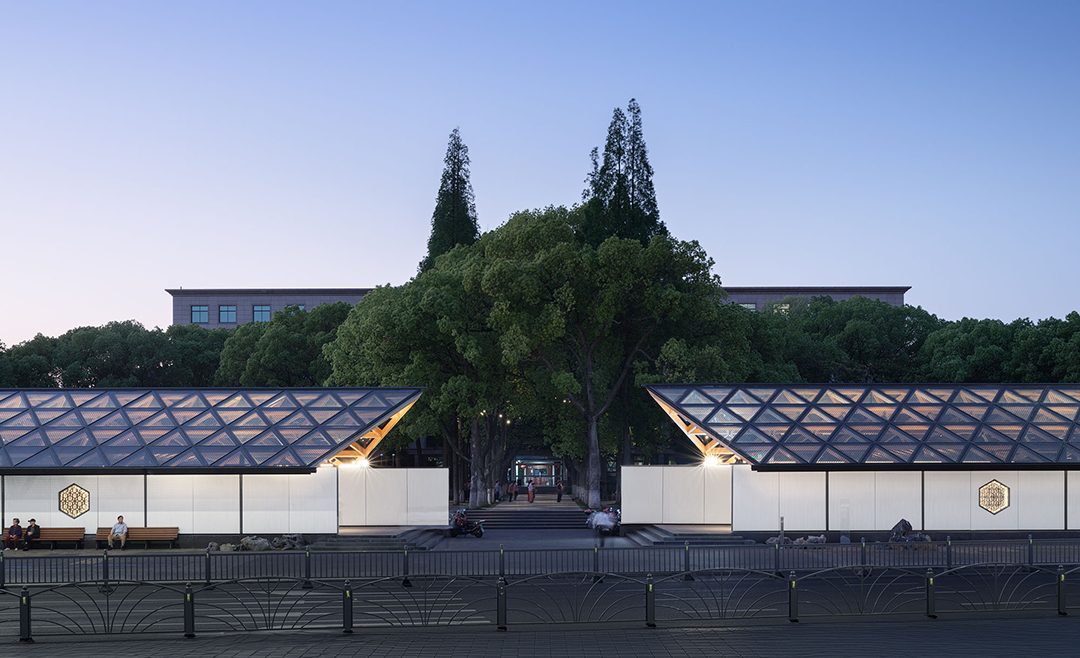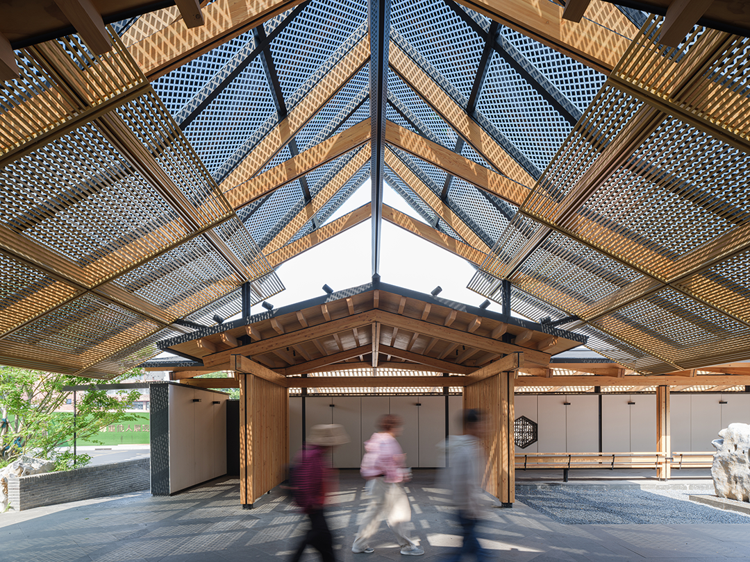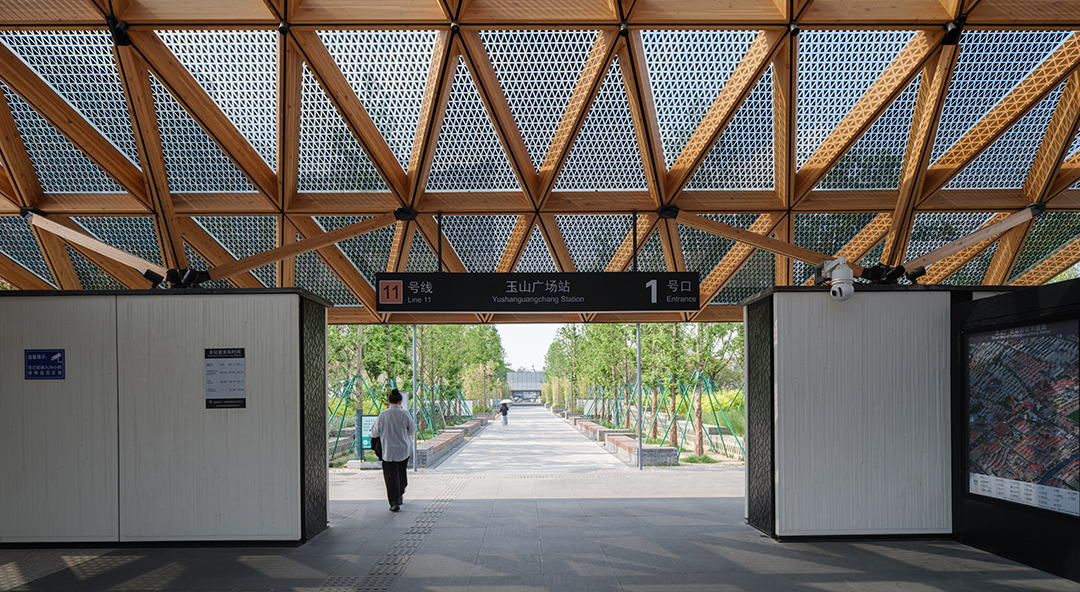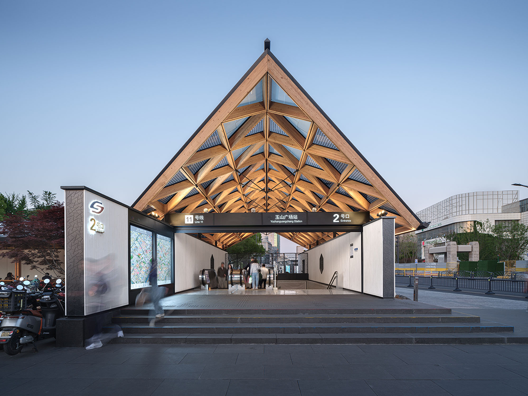 地铁站口建筑由此形成。钢木材质的网架结构、深色玻璃屋面、白色UHPC外墙以及花窗组合,都是对“粉墙黛瓦”的江南建筑和园林语言的现代式转译。