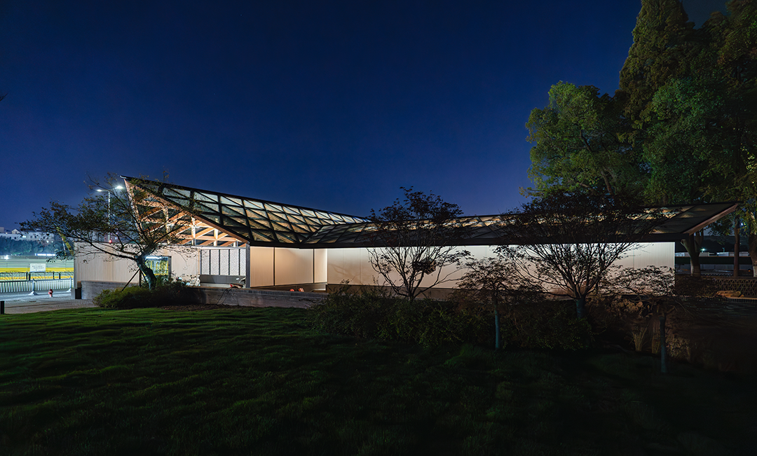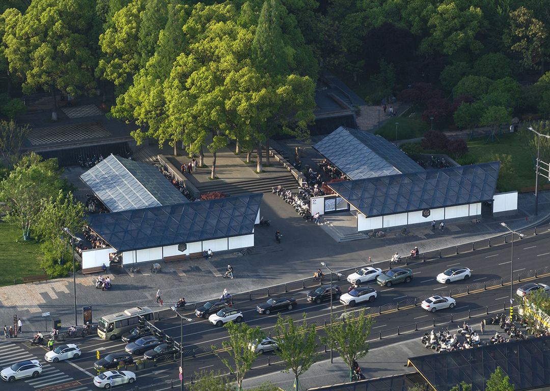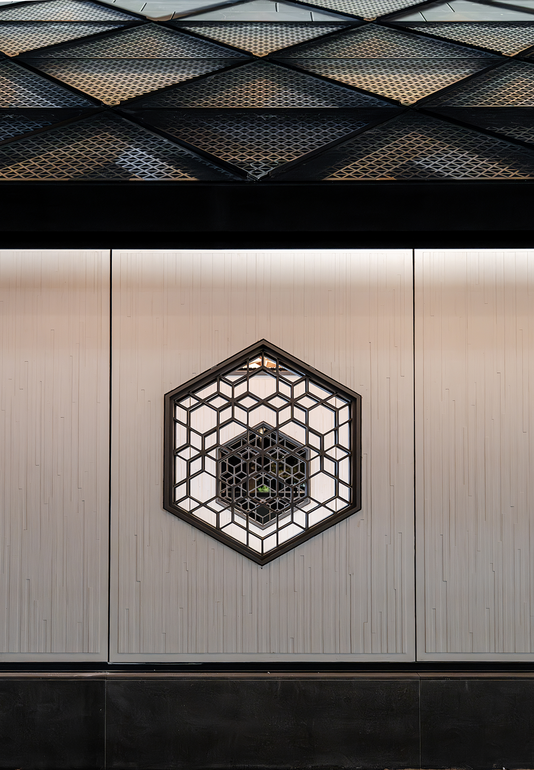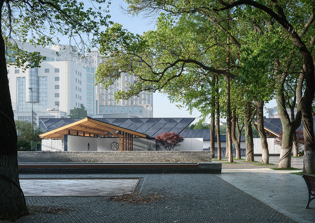地铁站口建筑由此形成。钢木材质的网架结构、深色玻璃屋面、白色UHPC外墙以及花窗组合,都是对“粉墙黛瓦”的江南建筑和园林语言的现代式转译。