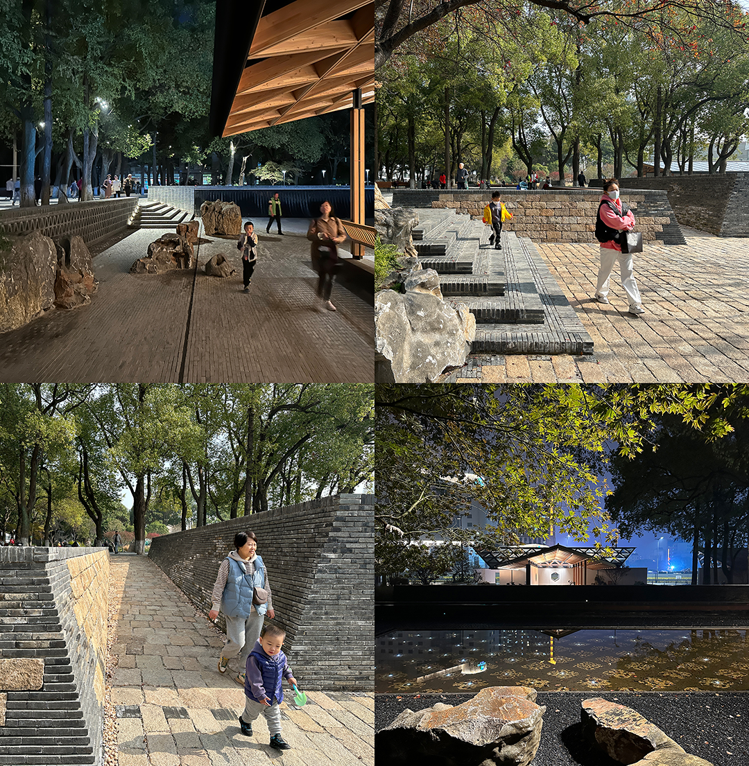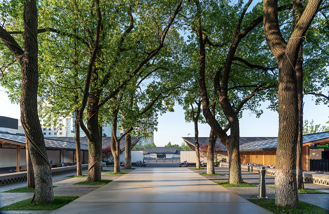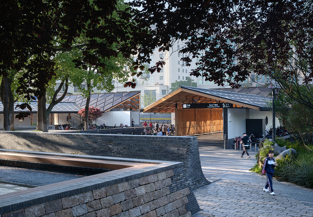 对照清道光年间的昆山县署图,可见玉山广场就处于旧时衙署的位置。现状玉山广场中早已不见历史遗存,却有参天的香樟和水杉林。广场为高出周边道路的一片台地,大树的树底也高于街道地面和地铁出入口的设计标高。为不破坏树根,设计在让出树根的区域将广场地面局部下沉,以平接地铁出入口和周边道路。去往站口的人行通道从各个方向汇入广场,隐没于场地的花径和矮墙中,行走其中颇有曲径通幽的意趣。