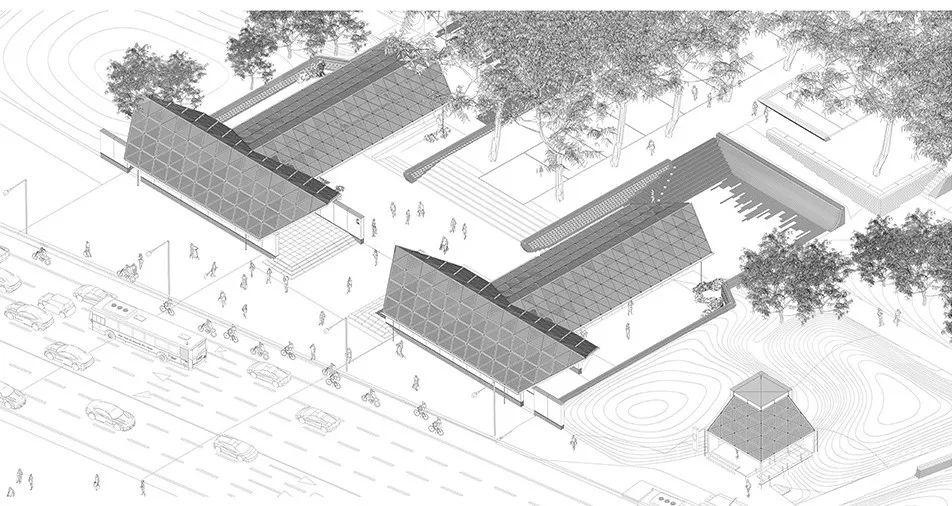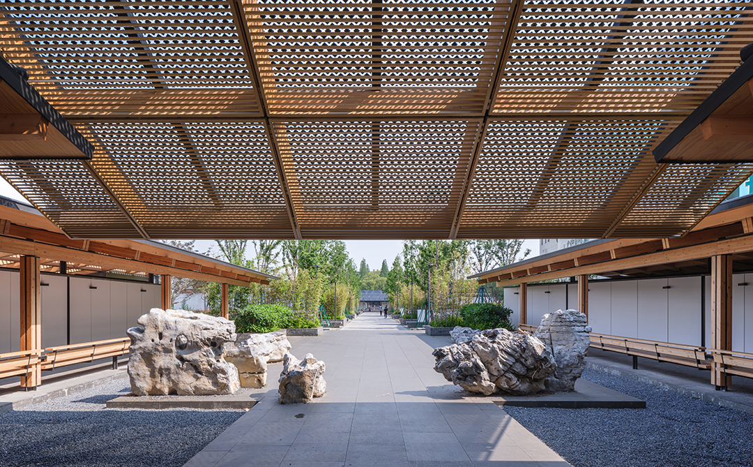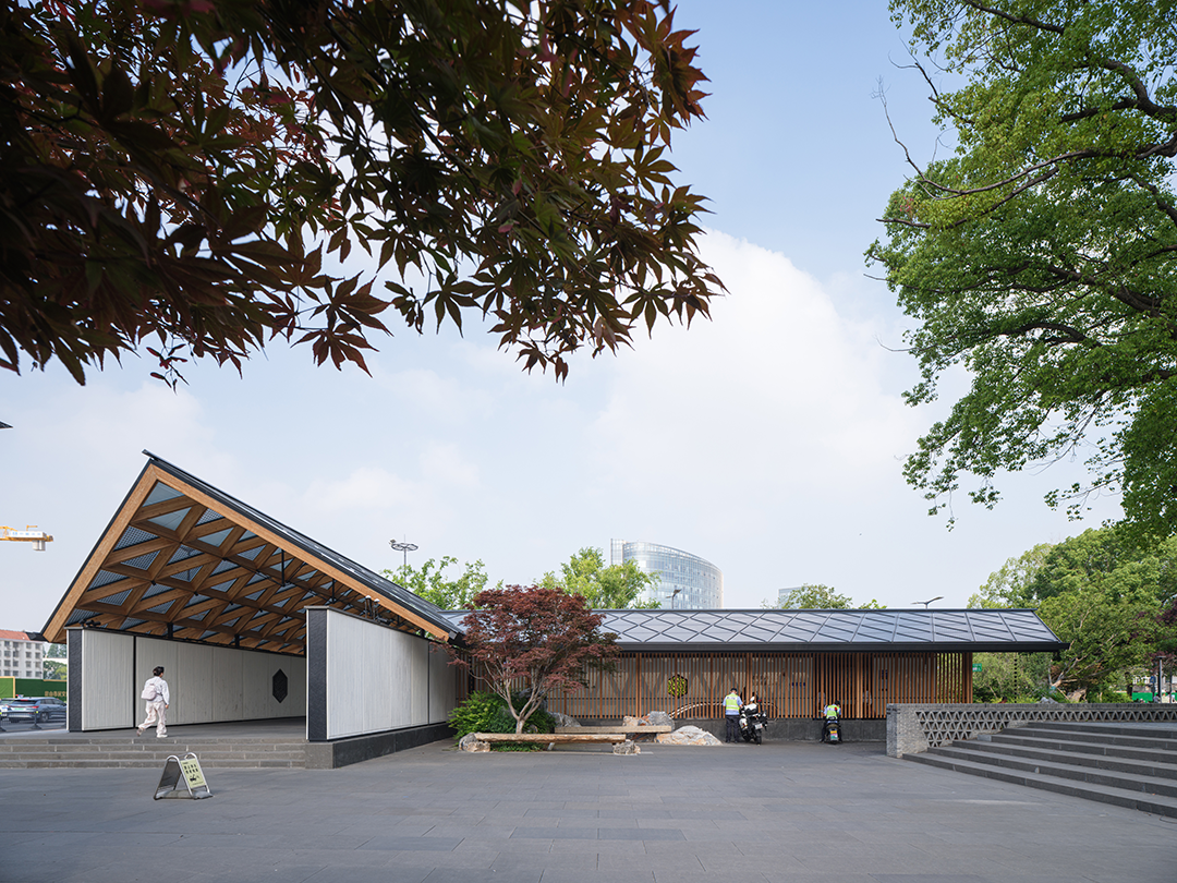 步行轴线在南端与人民路交汇。一组坡顶木构的休息廊在此整合了地铁的地上设备区和地下车库出口,形成轴线南端的收束。至此,这条昆山城历史上重要的地理标识再次展露于世人眼前。