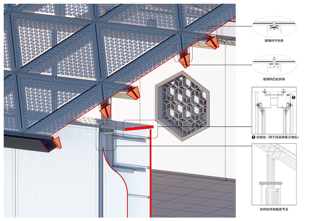 白色UHPC墙板构造:十字断面的两列钢柱支撑起整个屋面,并隐藏于双面UHPC干挂外墙板中,墙体与屋面间脱缝,引入自然风,同时增强屋面的悬浮感。挂板表面为纵向木纹肌理,墙板间有节奏地露出钢柱翼缘,结合压顶和墙裙的石材共同形成白色墙体上的深色格构,饰以花窗点缀,让人联想到江南园林中的景墙。