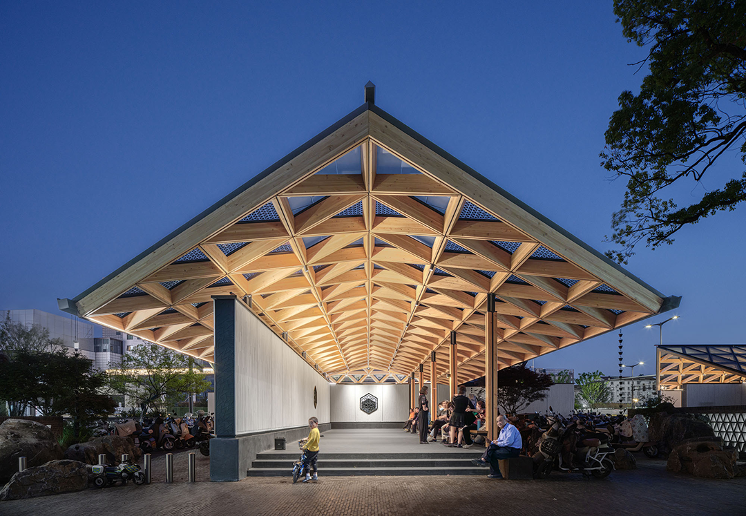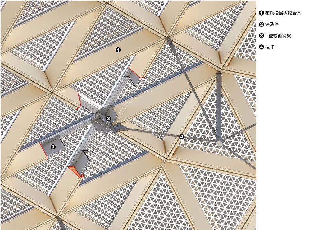 引入钢木混合结构:“T”字形的钢梁藏于木质腹板梁间,形成网架整体受力,使结构构件小型化,视觉上兼具木构的温和与现代建筑的轻盈;大跨度的屋架处以拉杆加强结构的稳定性。灯光和布线整合设计于装配式的屋架菱格单元之中。