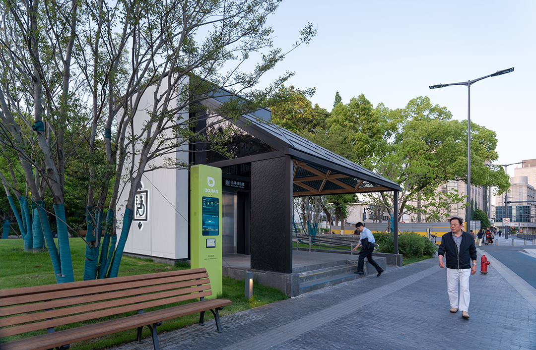 深色玻璃光伏屋面:深灰色彩釉玻璃与碲化镉光伏玻璃组合而成的深色玻璃屋面,保证了自然光受控的射入地下空间,明亮的出入环境成为乘客搭乘自动扶梯出地铁站时的第一体验。屋面玻璃的彩釉面外置,以增强屋顶的漫反射效果,外观质感接近传统江南建筑中青瓦屋面的视觉印象。