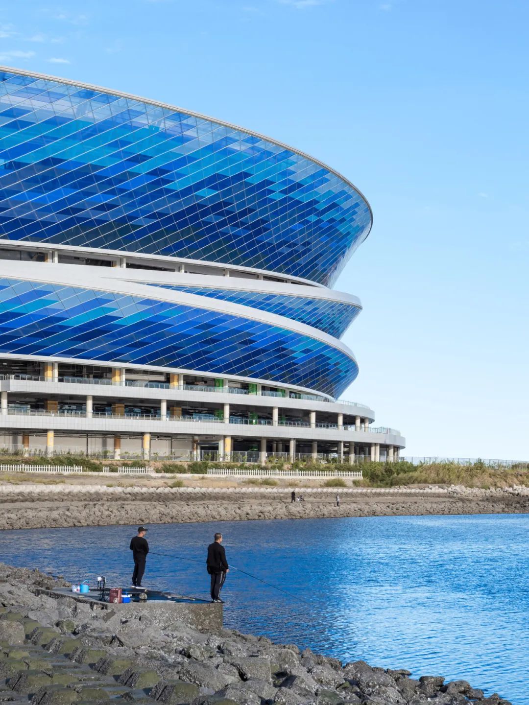 梭鱼湾足球场设计灵感来源于“海浪与海螺”,设计理念为“炫彩叠浪”,建筑立面定妆色“海洋蓝”,顶棚呈白色,“蓝海白云”与饰面象征波光粼粼的水之形态,将大连的海洋文化、足球精神融于一体。