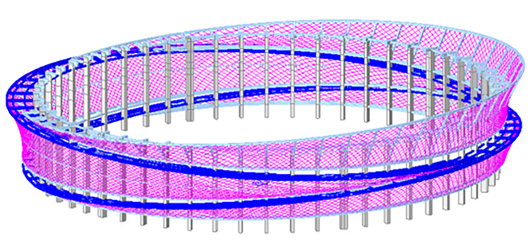 旋转坡道结构由坡道挑梁、坡道环梁及立面直纹曲面索网体系组成。坡道梁最大悬挑15米,梁下增加斜撑杆,承担墙面索网的拉力;立面材料采用彩色ETFE单层膜,利用等距斜拉索网形成立面直纹曲面,使建筑立面规整均匀,体系稳定;同时由于坡道将立面分割成三个部分,减小了形成立面直纹曲面主索的尺度,设计团队将原有的约200毫米直径缩小至30毫米,使立面结构更加轻巧纤细。