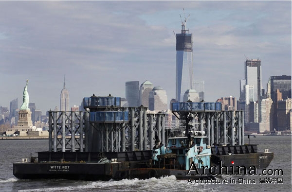据美国中文网12月12日报道,新世贸中心大楼尖顶抵达纽约港后,工人们于美国当地时间12日上午将其吊起置顶。