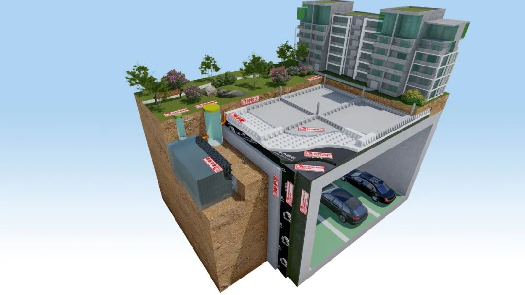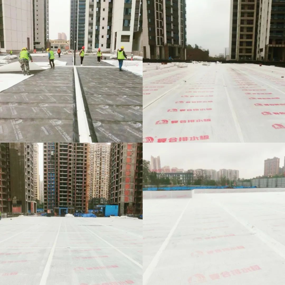传统工艺受制于坡度限制与工序繁杂,极易引发渗漏问题。而中交·锦上项目采用雨虹桃花源零坡度有组织防排蓄水系统通过虹吸复合排水板与专利高强排水槽的网格化布局,突破传统找坡限制,实现零坡度有组织排水。在抗压强度达450kPa的HDPE复合排水板与700kPa的高强排水槽协同作用下,系统既能够保障排水稳定性,又大幅缩短施工周期——在此次项目中,施工团队仅用15天完成3万平方米顶板排水工程,较传统工艺效率提升50%。