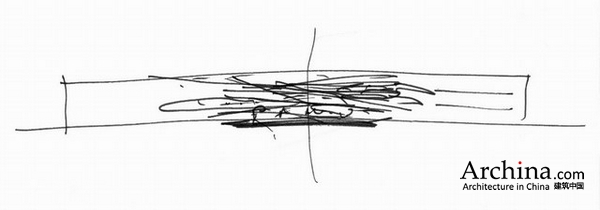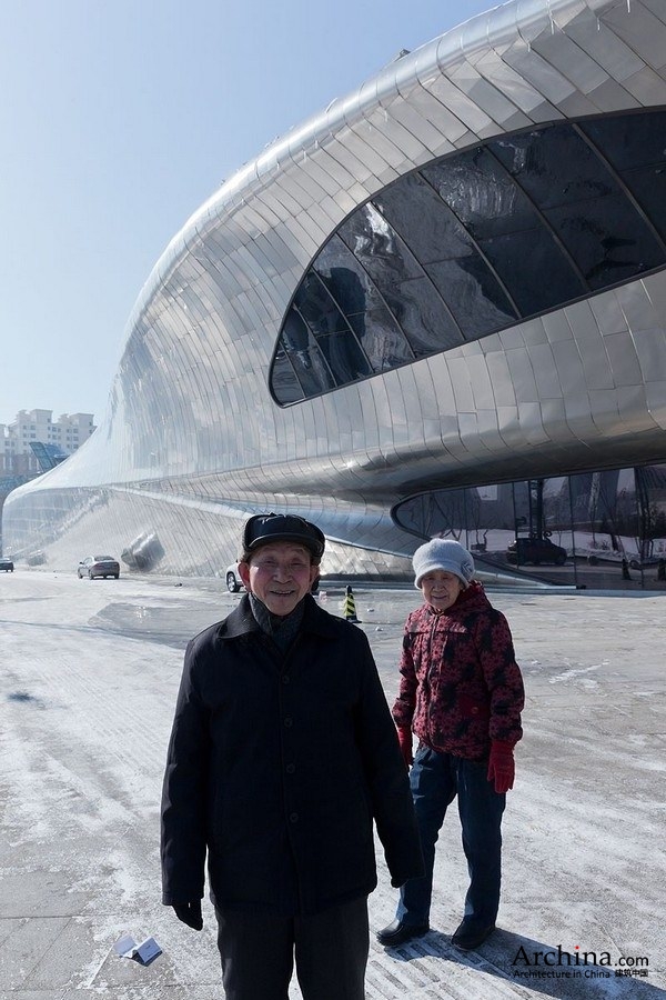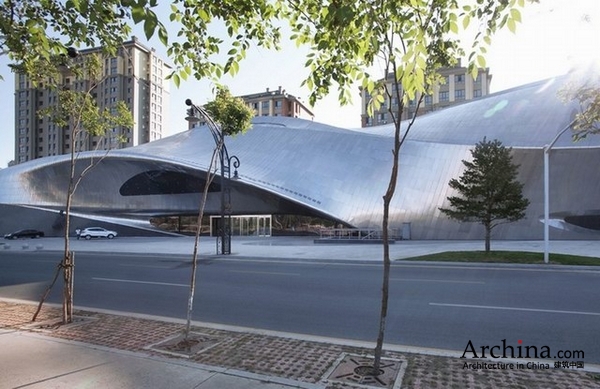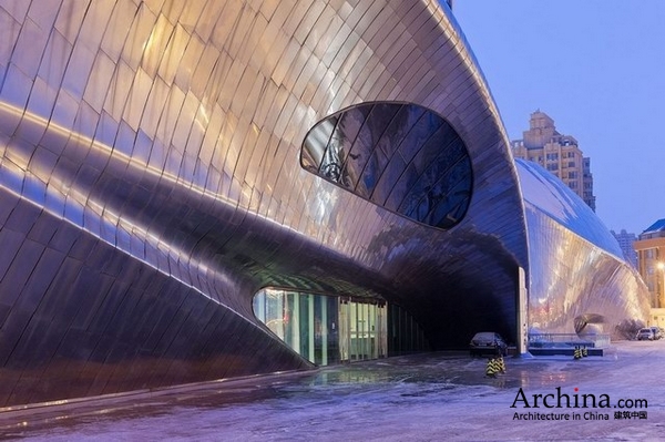 哈尔滨冰天一色的冰雪世界,一束仿佛在急速运动中被冷冻静止的水流凝固在那里,变成了这座城市的美术馆。高亮的金属外皮与天同色,与地相连。运动产生的力在建筑中间位置使其产生了扭转,制造出建筑的入口,让人产生无限联想和进入的冲动。