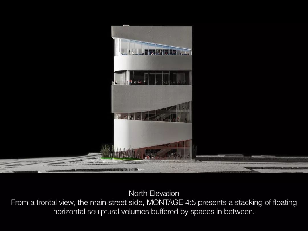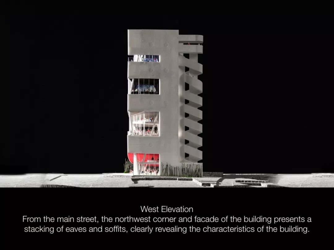 Mass Studies的设计师参赛团队中唯一一家采用多种交通方式连接上下楼层的设计提案,这样的设计让电影资料馆成为真正意义上的公共建筑。从建筑造型上看,资料馆呈现着由多个体量堆叠的形式,体量与体量之间保留的间隙,让建筑呈现漂浮的状态。建筑从街道的每个界面都呈现出不一样的状态,犹如电影中的“蒙太奇”手法。这是一个能让人十分容易理解的设计,平面与造型的处理十分的简洁自然,对于那些热爱电影和建筑的人来说,它将是一个伟大的公共艺术。