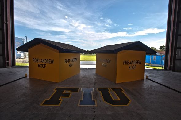 国际飓风研究中心预防措施、经济与金融研究实验室负责人沙希德-哈米德表示:“我们正在研究的最后结果不仅能挽救生命,还会减少财产损失,继而降低保险费。”为展示这部模拟装置的威力,这个科研小组专门建造了2个模型结构。每个试验对象有花园凉棚一般大,而且被涂上学校的标志性颜色——蓝色和金色。一个模型结构使用了安德鲁飓风前的建筑标准。另一个使用了安德鲁后颁布的更高标准,把更硬的钉子、更厚的胶合板衬板、更重的屋面油毡、更厚的屋顶板和其他改进材料融合在一起。