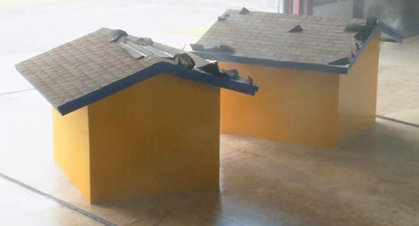 数字风速表显示每小时109公里(约合174公里)时,一半更厚屋顶板开始被陆续剥掉,此时相当于二级飓风。三级飓风时,根据安德鲁飓风前建筑标准建造的模型结构的屋顶失去一半用于防水的沥青纸。到四级飓风,整个较薄胶合板衬板部分开始严重变形,接着瞬间飞了出去。