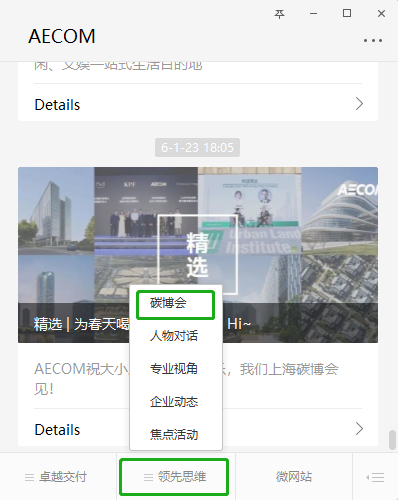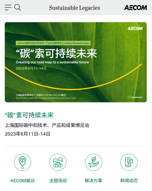 AECOM展位里有哪些精彩亮点?我们的碳博会专题页面告诉您!您可以在微信公众号菜单栏中找到页面入口,展会期间,我们也将同步更新现场动态、活动资讯和媒体报道等信息。现在就添加收藏,即可随时随地获取最新讯息!
