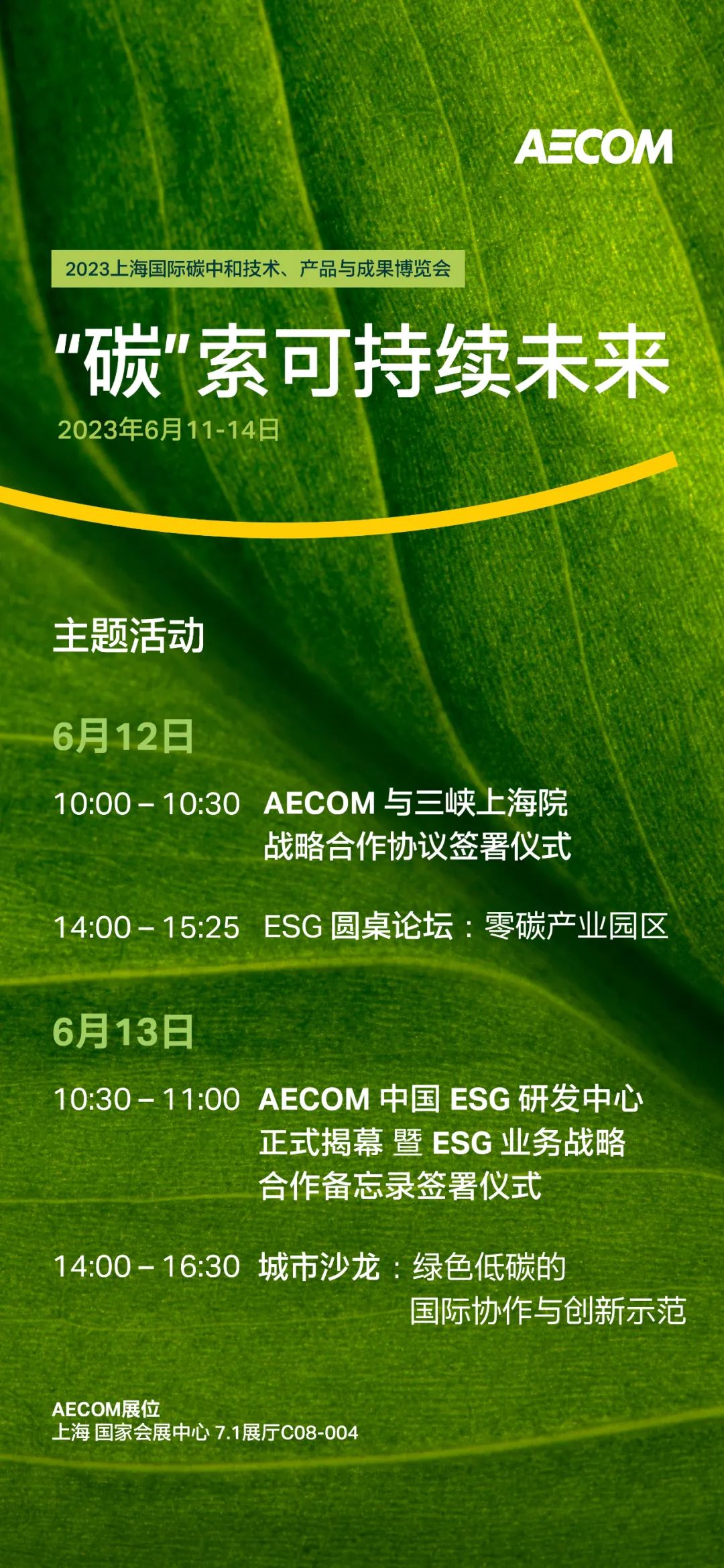 我们希望通过本届碳博会与业界深入沟通交流,共同推动行业绿色变革。6月11-14号,AECOM等您来共“碳”可持续未来!