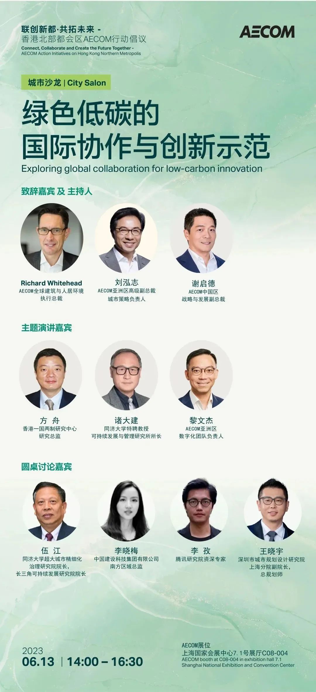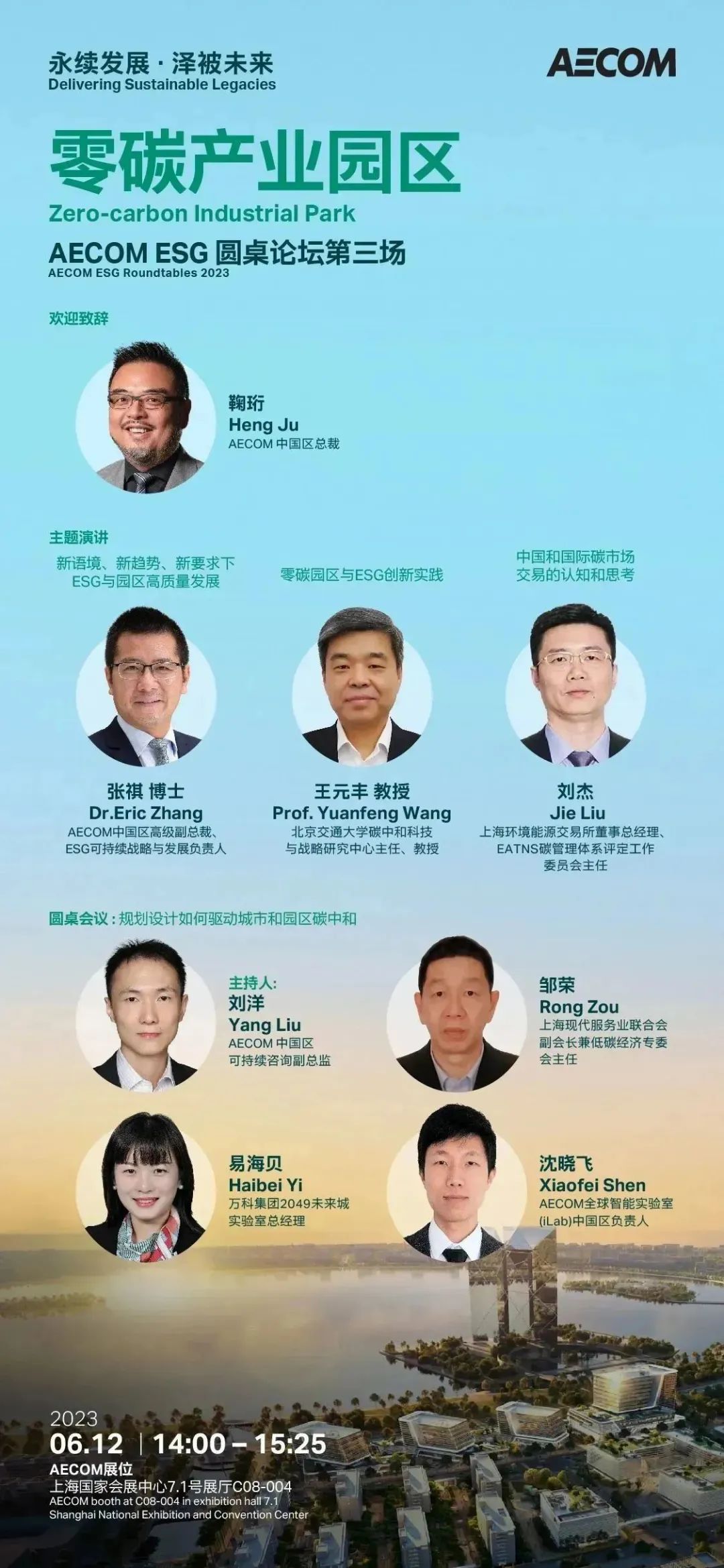 6月12、13日,我们将在AECOM展位连续举办四场主题活动,与大型综合性企业、甲级综合设计院深化拓宽战略合作,共同助推行业低碳发展;更将邀请多位行业专家、学者莅临展区,围绕绿色低碳实践展开深入交流与探讨。