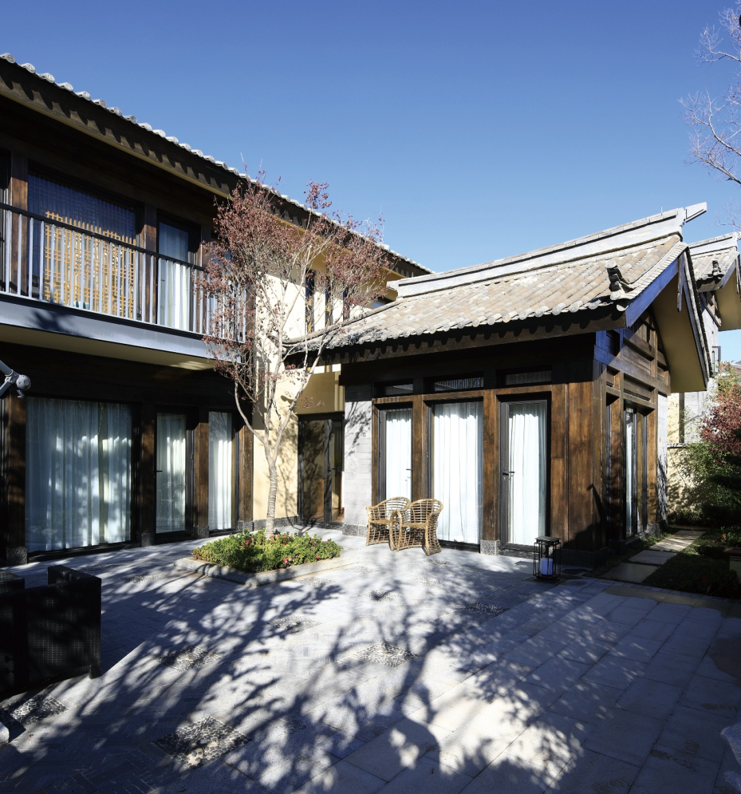 建筑立面的设计引用传统纳西族及中国建筑语言和元素,以现代手法演绎柱、梁、挑檐、山形屋顶、屏风、雕花、几何图案、灯笼等元素,古朴与时代感并重。材料以当地石材、木材及青瓦面为主,将丽江纳西本土文化融入各处。