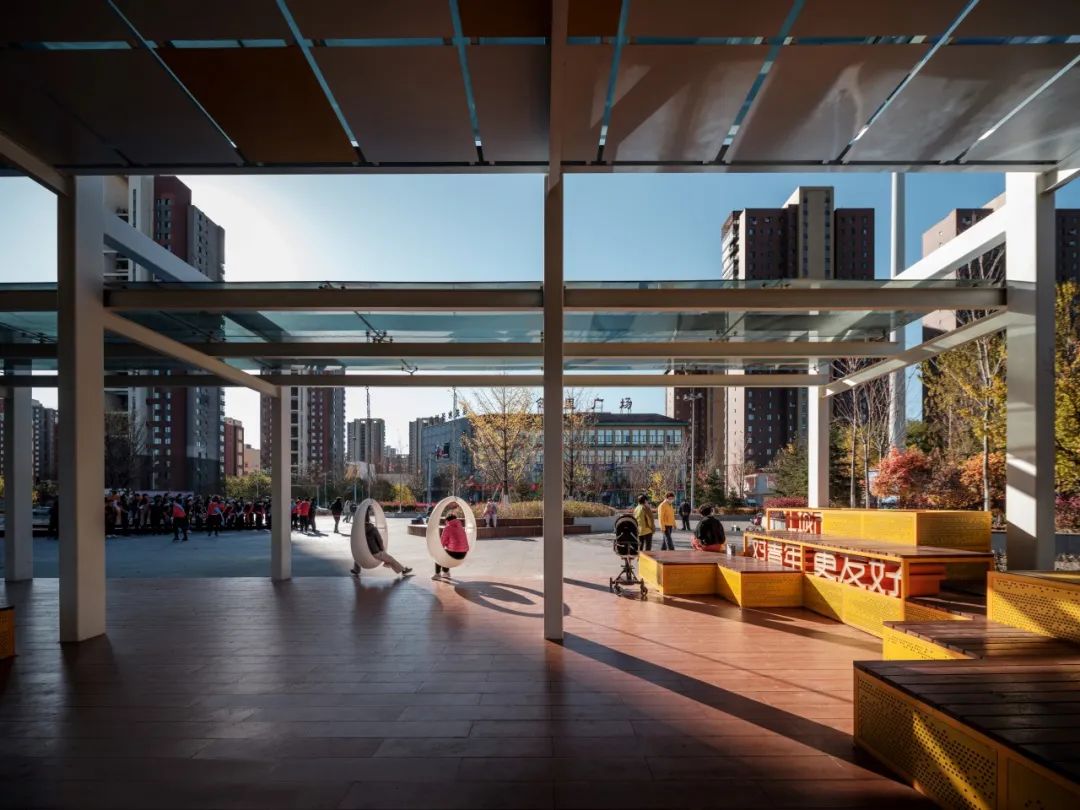 场地里功能单一的小场景被重整,包括公交车站、邻里街角、校前空间,到沿路小街等区域,打造出9个鼓励人们使用的能量补给站;四个重要交汇路口也被再造为标识性的街角,在优化城市界面体验、强化居民归属感的同时,也促进和激发了沿街业态的潜在增值。