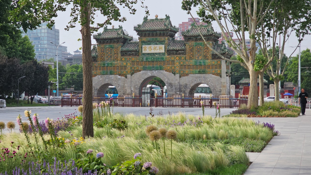 北京神路街上的琉璃牌坊,承载着重要的城市历史文化记忆。经过改造,原被用作临时停车场的琉璃牌坊南侧空间再生为如今的东岳文化广场,成为市民“坐得下、记得住、待得久”的城市公共休闲空间。