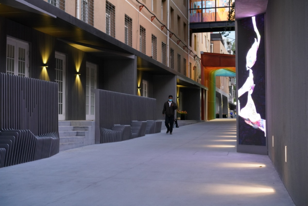 漫步在朝外片区,可以在拓宽、更美且舒适的街道中,与街角的口袋公园相遇,也可以偶遇展示艺术生活的最美胡同——化家胡同,在艺术氛围中坐在流线形公共艺术座椅上小憩,还可以在晚上遇见文化灯光景墙。