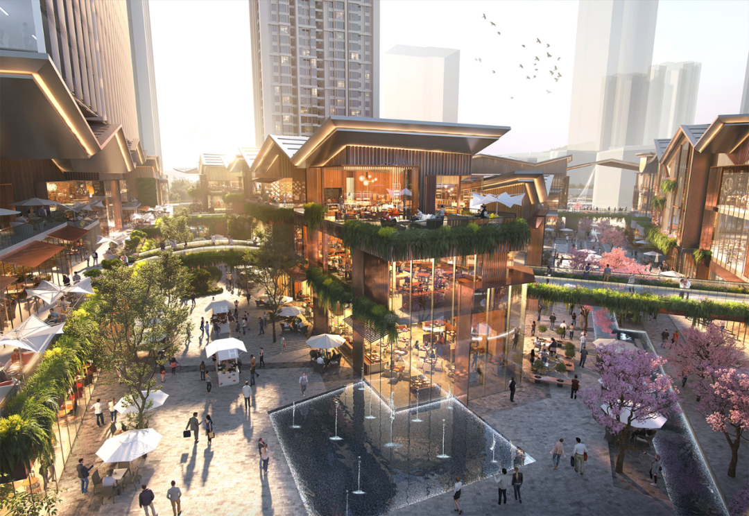 三镇中心的总体空间布局以LOOP环为概念,运用“街、里、园”三种不同尺度空间结构——最宽的“街”是主要的活动发生地,较窄的“里”营造内聚向心的感受,小尺度的“园”形塑园林步移景异的体验,来塑造体验多变的舒适空间氛围。