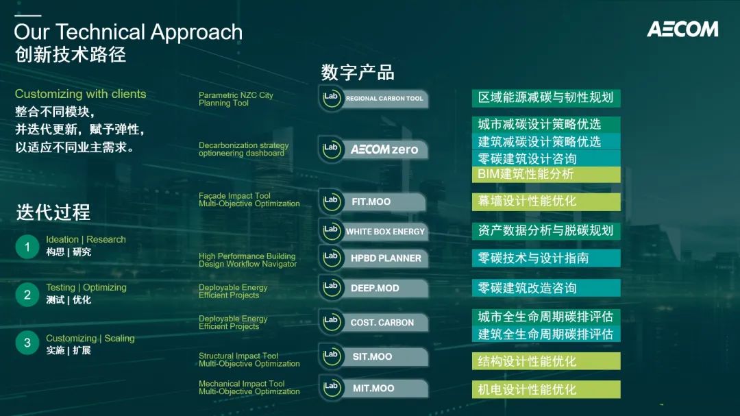 讲座中,他分享了iLab团队提供的定制、创新、高效的数字解决方案和设计流程,包括预先规划策略、加速项目初期布局、优化数字性能以促进实时决策;可操作城市与建筑减碳设计策略优选、零碳建筑设计咨询、BIM建筑性能分析的AECOMzero,以及提供零碳技术与设计指南的HPBD PLANNER等数字产品,如何基于客户未来愿景和战略定位设计创新模块,为其预先筹划策略,提供更快速、更准确的决策基础。