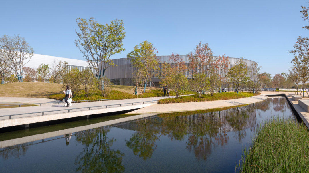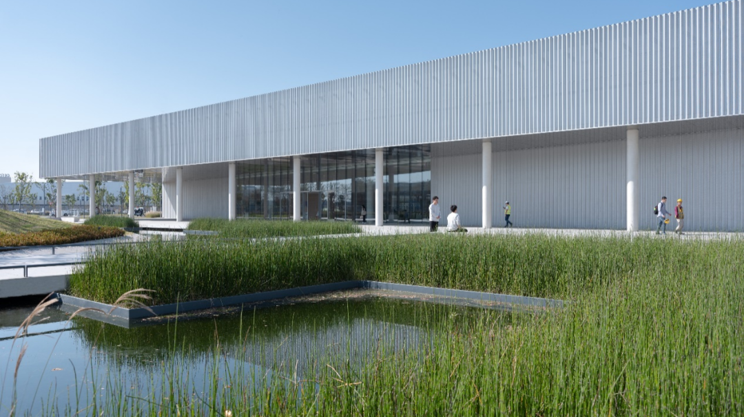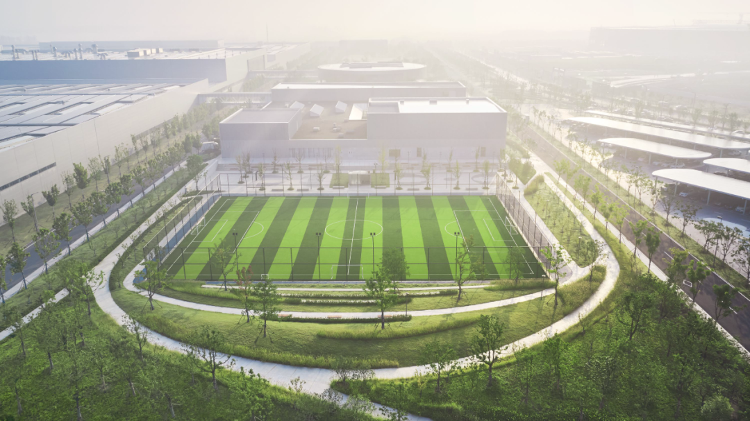 传统的工厂与景观空间的边界,被自然地形化解。低碳措施和可持续理念,与景观建设的方方面面相融合,包括在设计考虑涵盖土方平衡计算、构建多功能绿色空间、设置雨水调蓄池,并利用可再生能源支持景观的维护,具体包含新植入的一千多棵本土树种、超过3万立方的雨水调蓄地形空间、每天产生超过10,000度电用于厂区生产与室外照明的光伏停车场,以及每天处理200吨再生水回用于景观水面循环与园区植物灌溉。