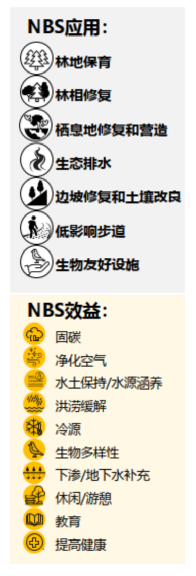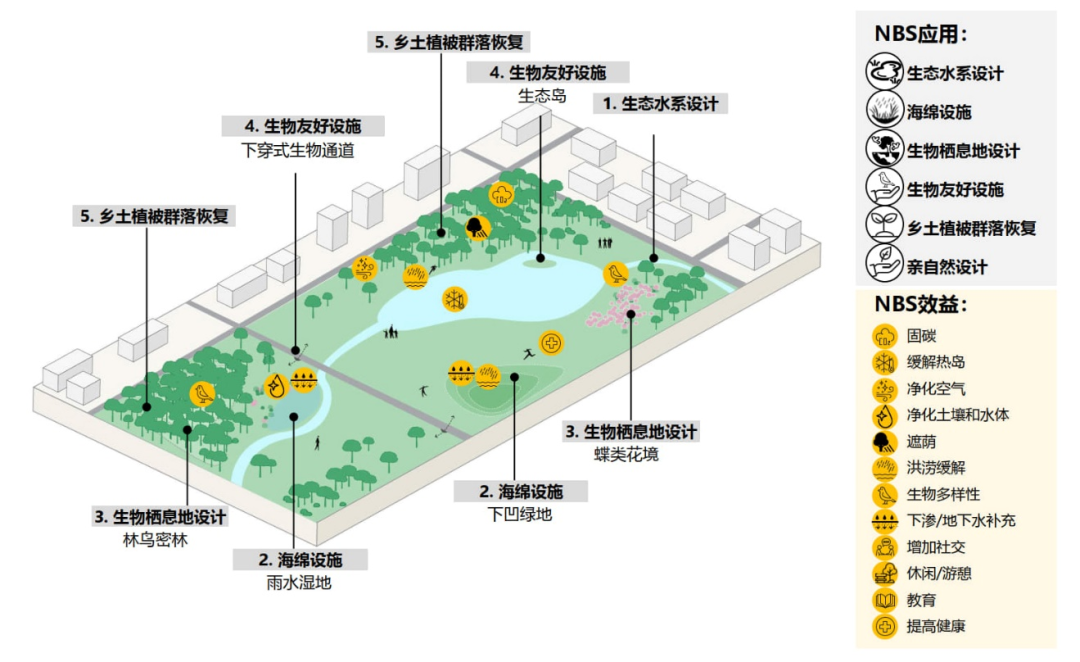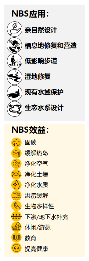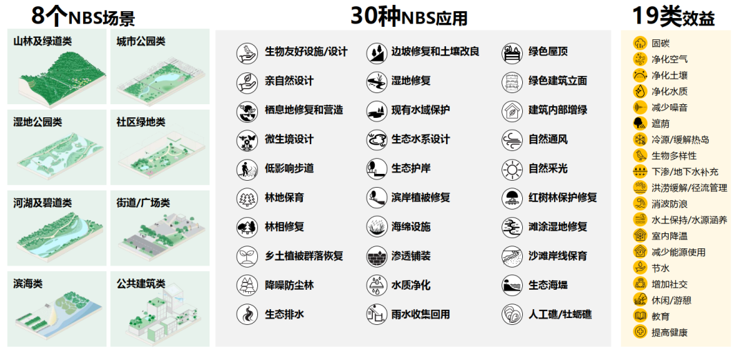 从通常靠近城市中心的城市公园、社区绿地、街道/广场、公共建筑,到更亲近大自然的山林及绿道、湿地公园、河湖及碧道、滨海空间,基于自然的解决方案(NbS)可通过30种或更多的应用方式,在建设、更新改造、维护这些城市场景的过程中带来19类积极效益。