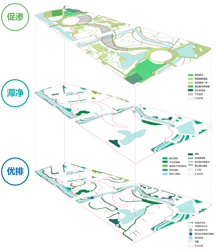 01 从源头到末端的全过程暴雨雨洪管理:通过促渗、滞净、优排三大体系构建完善的海绵城市系统,对场地雨水径流进行最佳管理。