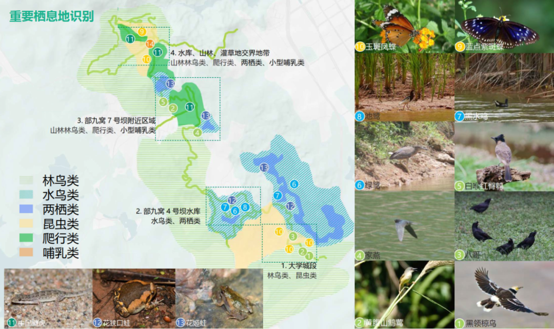 01 师法自然,从观察自然开始,维护本土物种栖地:梳理绿道沿线的现状生物多样性资源,对现有的高质量栖息地环境进行指认,保证绿道的主线车行道建设避开这些现状高价值栖息地环境,并保持一定距离设置低影响观鸟步道和设施,以求在保护的同时让市民能体验到生态之美。