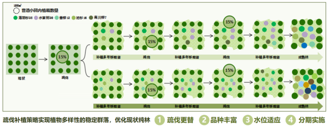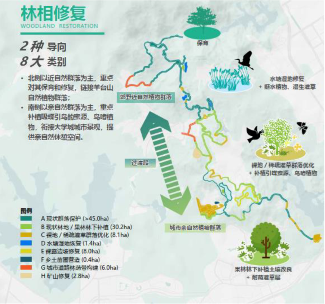 02 修复近自然植被群落,鼓励自然演替:针对现状植被覆盖类型,实施包括保育、疏伐补植、套种补植、边坡复绿等生态保护和修复措施;以低维护本地植物为主,结合光照条件、水湿环境、水土保持和诱鸟诱蝶生态功能需求,构建北段近自然森林群落和南段城市亲自然植被群落。