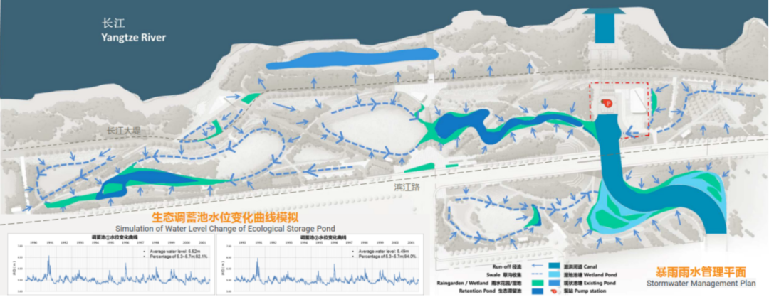01 海绵城市暴雨管理:在对场地近10年水文数据分析的基础上,对生态调蓄设施的规模、常水位、调蓄水位进行了深入的分析;在充分利用场地现状水塘和低洼地打造生态调蓄设施之时,兼顾景观和植物的营造进行水位水深设计,从而打造出具有多重效益的生态调蓄设施以保障汛期安全。