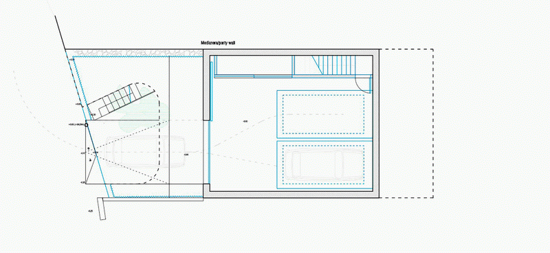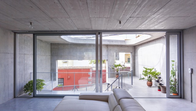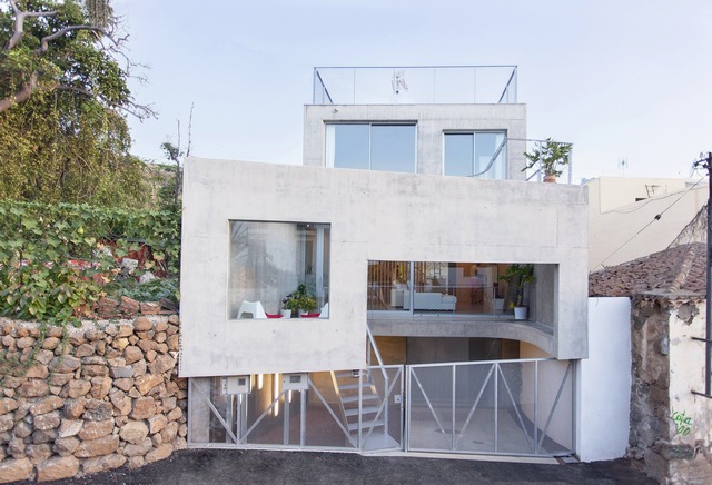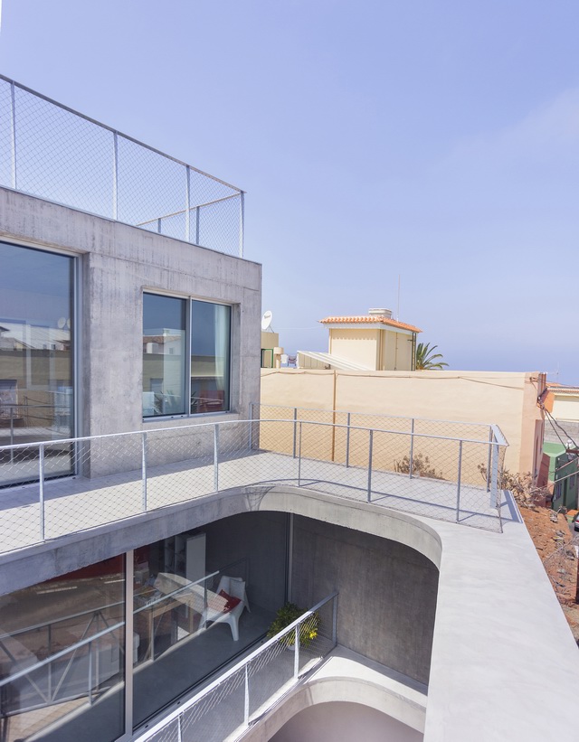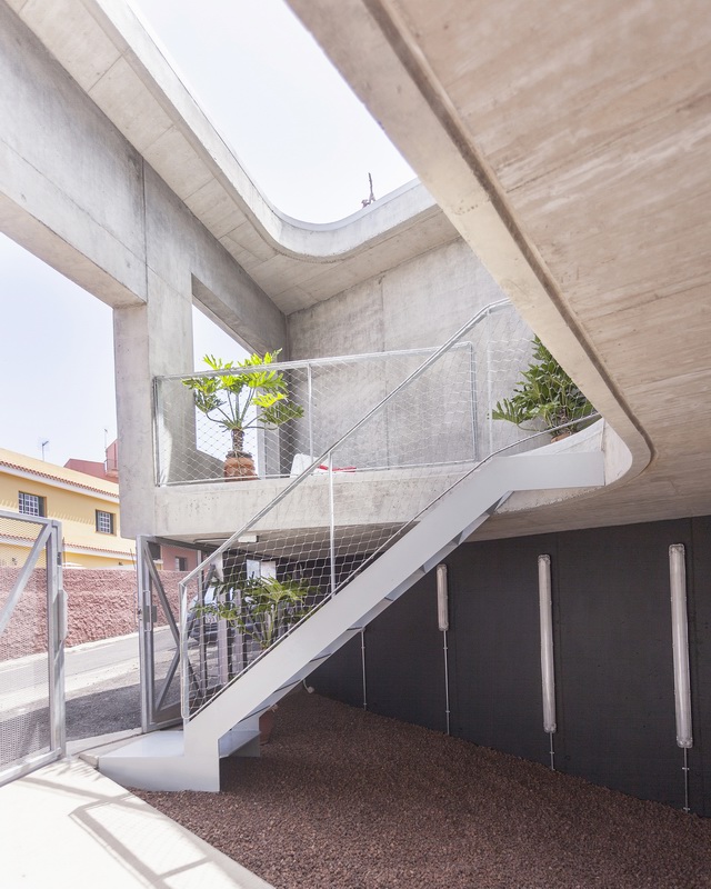 不看文字介绍,一定会觉得这是座日本某城市的集约式住宅。然而在距离上有着十万八千里,G House位于西班牙El Sauzal,一个基本不受规划控制的地区。这里的房子有大有小,年龄也各不相同。G House的用地十分具有挑战性,场地面宽6.5米,一侧是山坡挡土墙,另一侧的邻居沧桑的几乎快倒塌。进深方向有不大的高差,其中一侧被设计成下沉式,可进入半地下车库。G House由Esaú Acosta工作室设计,外部以裸露的混凝土打造,通过二三层的相互错动产生一个宽敞的露台。