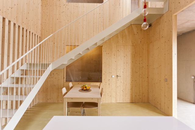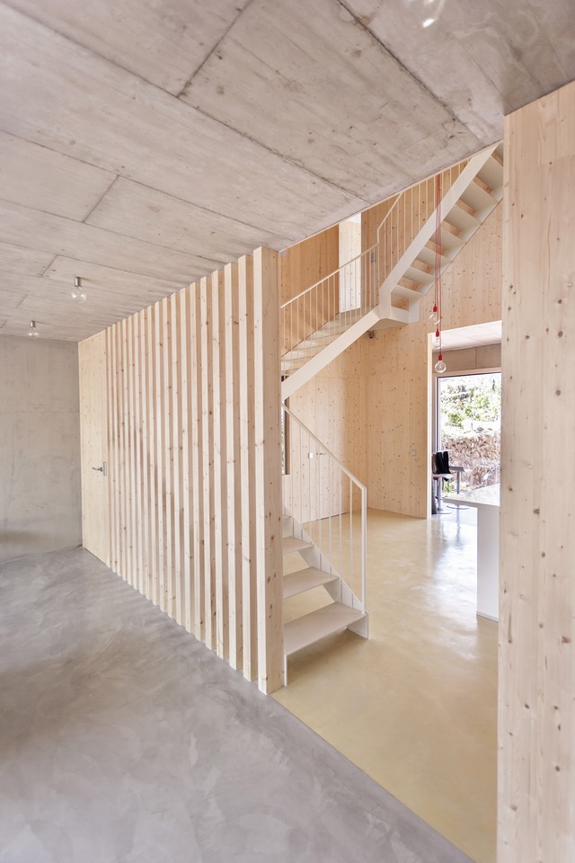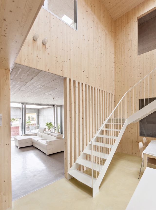 设计中最有趣的是前院,所谓庭院其实院子的首层是进入车库的坡道,然而二三层悬挑出来的阳台对这个空间呈半围合状,在空间上形成了有趣的层次,以及这里作为灰空间的内外融合。是一个夏天不错的室外活动休息所在。